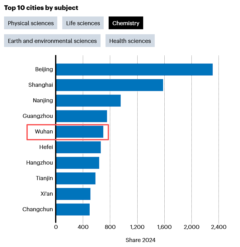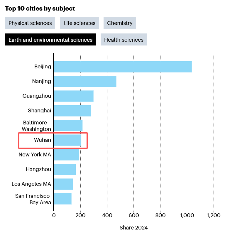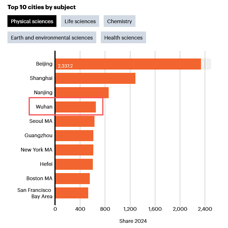此次排名追踪了各城市在高质量自然科学期刊上的科研产出。除北京、上海稳居前列外,南京、广州、武汉、杭州跻身全球十强。增刊还分析了学科表现,中国城市在化学、物理科学、地球与环境科学领域优势明显,甚至首次包揽化学领域全球前十。其中,武汉在物理科学、化学和地球与环境科学领域分别高居全球第4、第5和第6位,显示出雄厚的综合科研实力。