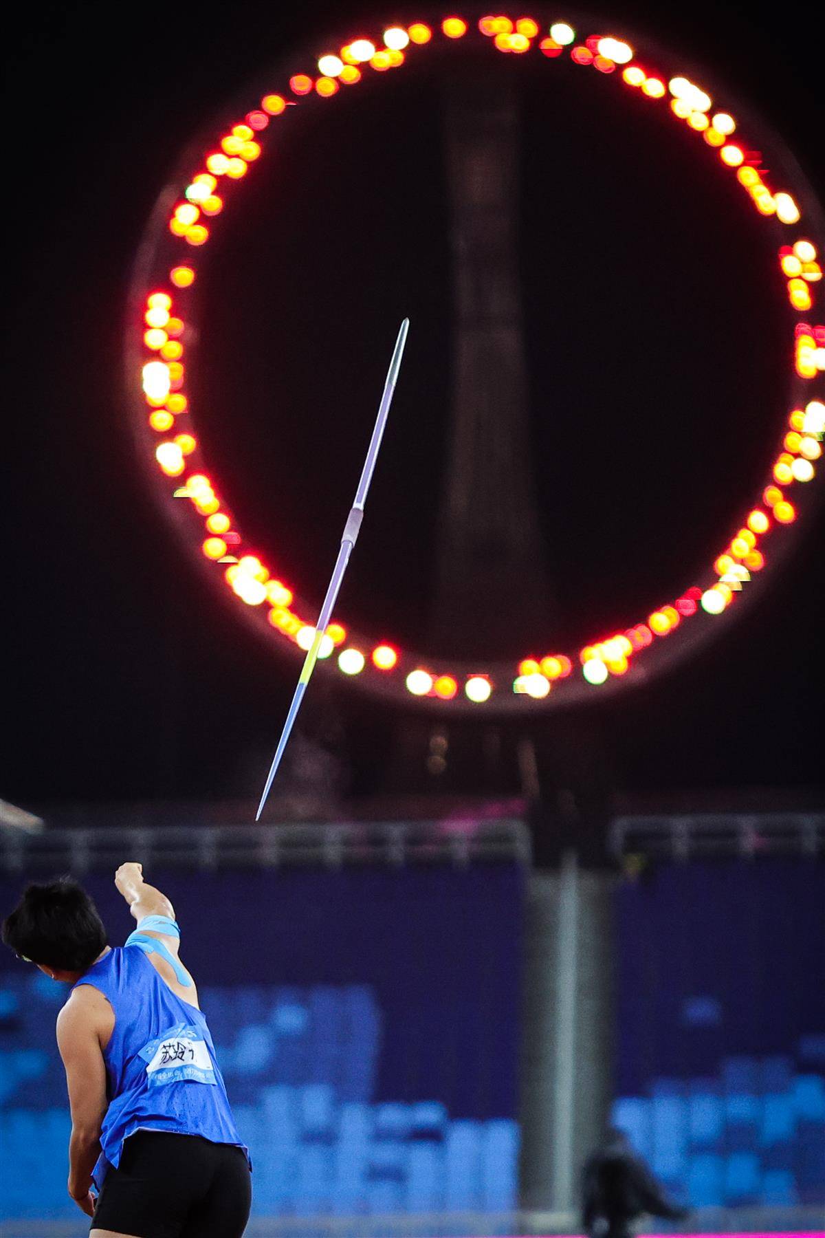在十五运会圣火的映照下,苏玲丹掷出了锁定金牌的标枪。(湖北日报全媒记者 时龚 摄)