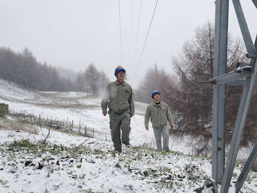 火烧坪供电所员工刘宗照、田地平、毛传玉、吕清元等顶风冒雪,前往海拔较高的35千伏赵乐线,对10至18号铁塔区段展开特巡。他们脚踏积雪,手持专业工具,仔细检查每一基铁塔、每一段线路的运行状况,重点观测导线弧垂、绝缘子及金具的覆冰情况,并详细记录相关数据,不放过任何一处安全隐患。