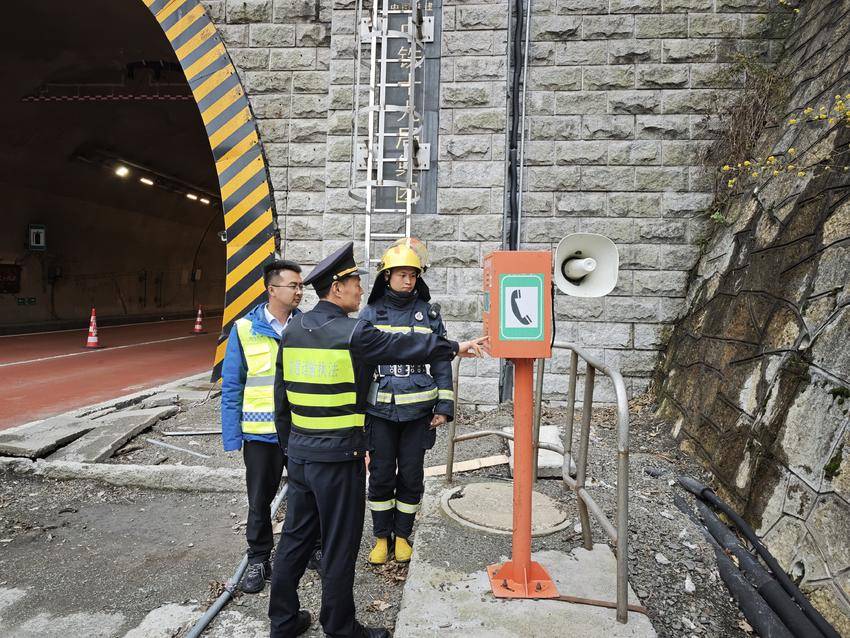 金龙隧道地质条件复杂、通行流量大,安全防控至关重要。行动中,工作人员沿隧道逐段进行排查,重点核查灭火器压力是否达标、外观有无破损,细致检查消防栓接口密封性、出水压力及水源供给情况,同步对隧道内紧急求助电话进行测试,确保通话清晰、联动响应高效。