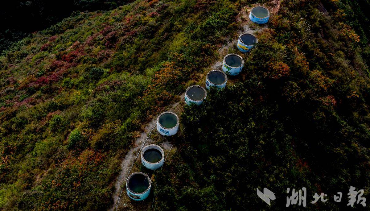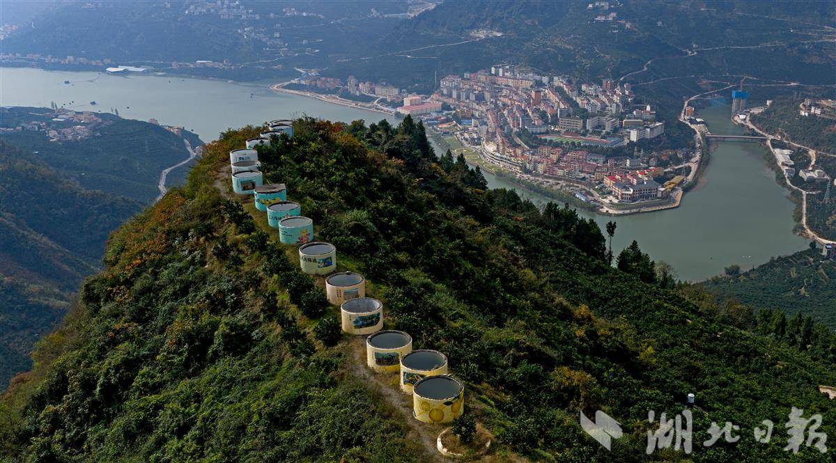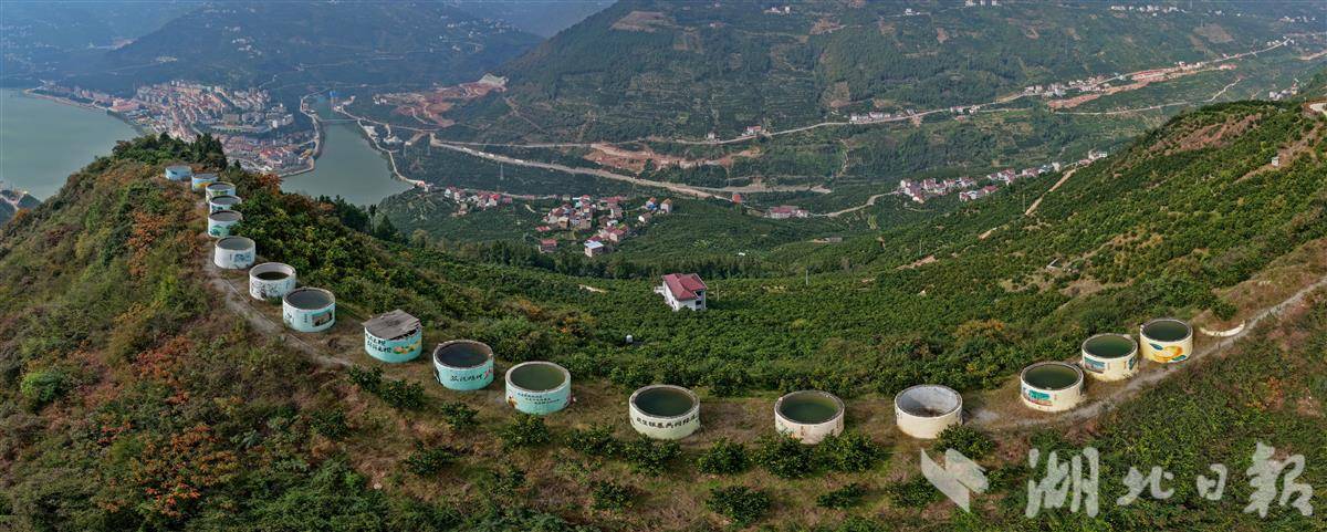 11月15日,在秭归县水田坝镇王家桥村盘山公路远眺,山巅18个15立方米的蓄水池一字排开,与橙林、集镇相映成趣,成为干旱坡地脐橙的“水保障”。