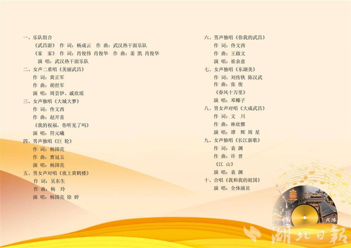 本次音乐会集中展现了近年来“武汉音乐地图”的创作成果。其中,《东湖美》获评2023年原创优秀歌曲,《夜上黄鹤楼》荣获2024年原创优秀歌曲,《长江新歌》入围2025年原创歌词征集评选。《美丽武昌》更是“群星奖”获奖作品。