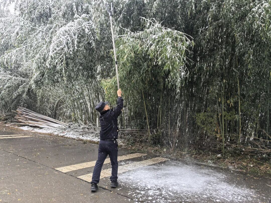 ▲发现部分路边竹子因积雪压弯可能断裂影响道路通行,兴山县民警主动出击消除隐患。