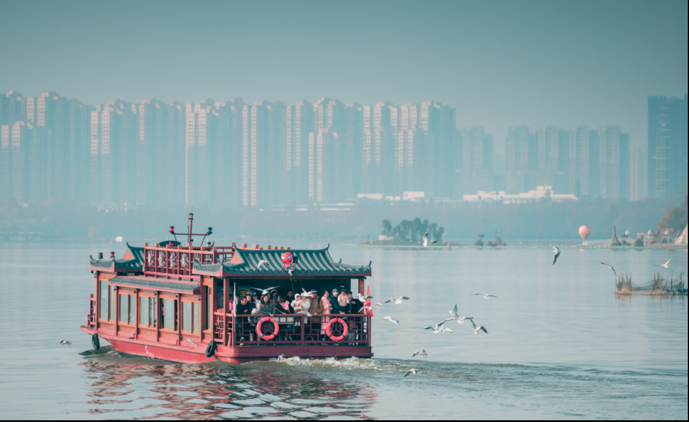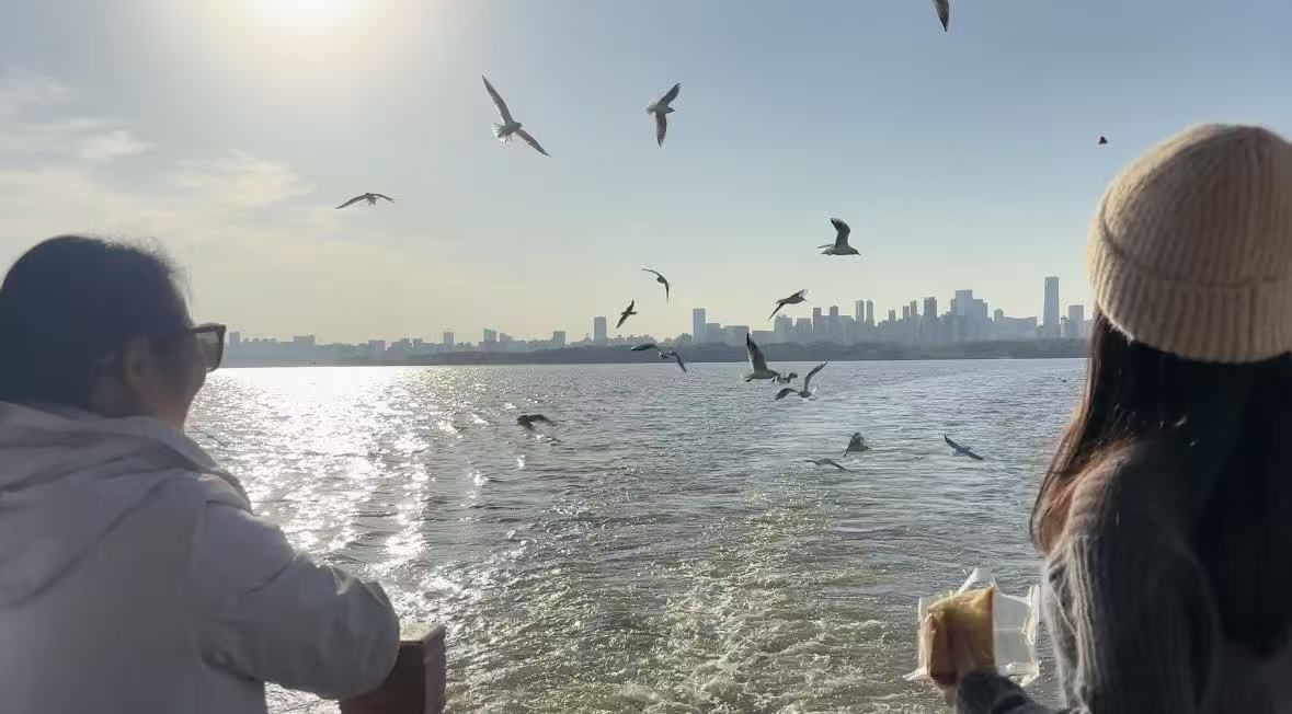 “快看!那只红嘴鸥的翅膀展开像一把扇子!”游客陈女士举着相机,专注地捕捉着红嘴鸥的每一个动作。她告诉记者,自己专程来东湖体验“人鸥同游”的独特场景,“以前只在手机里看过这种画面,没想到在东湖就能实现!它们跟随游船一起起舞,太震撼了”。