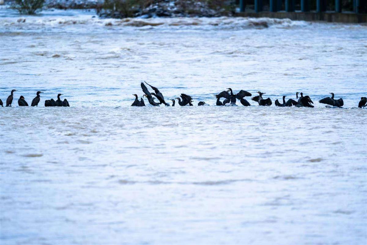 成群的鸬鹚在河里捕鱼