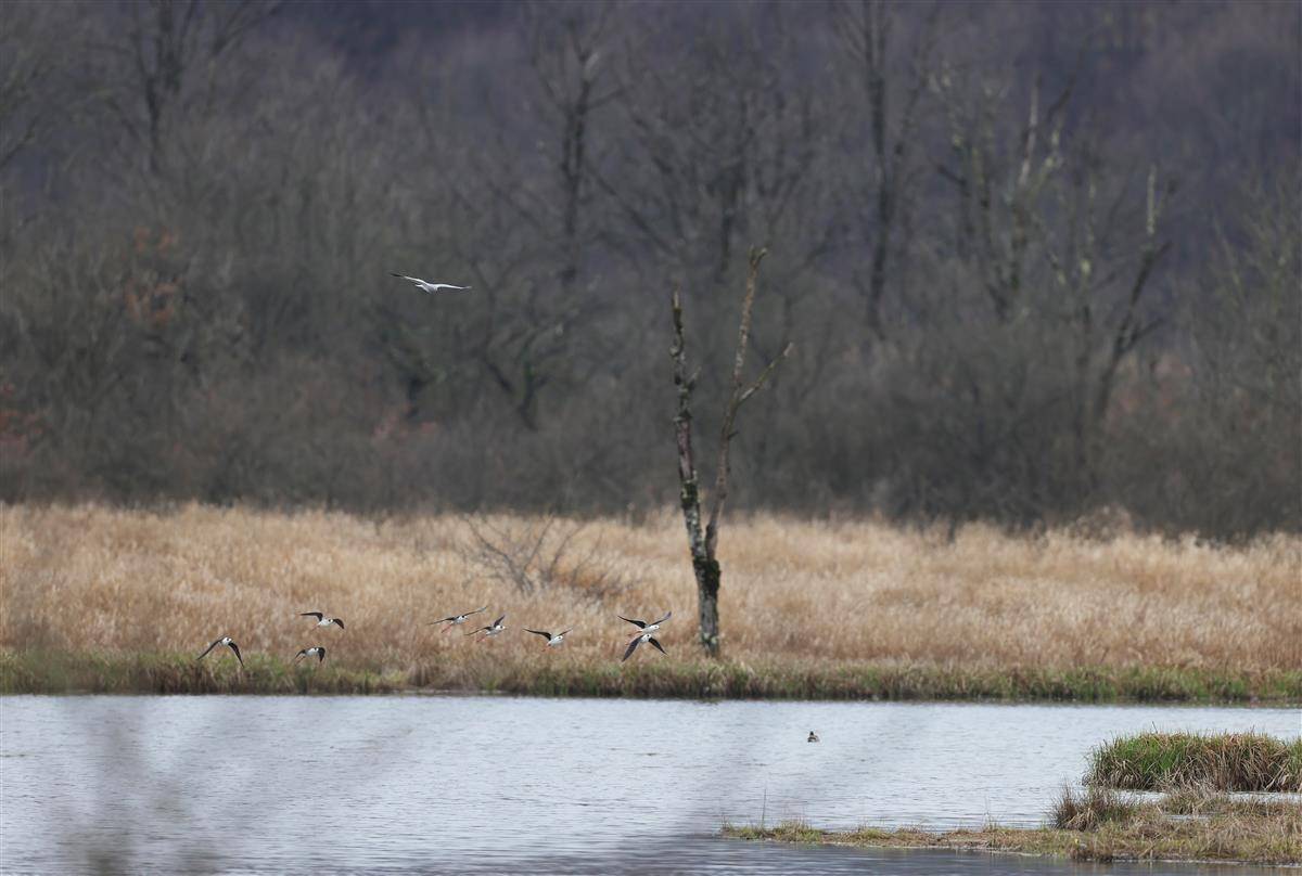 成群的黑翅长脚鹬在大九湖湿地觅食。