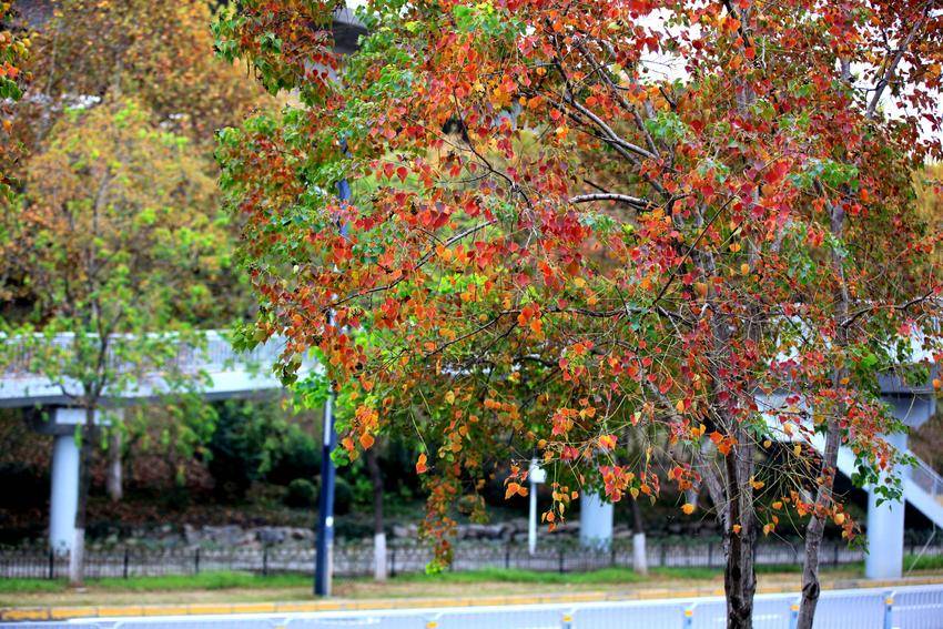 湖北日报客户端讯(通讯员杜媛媛 吕学勇 张忱)深秋时节,武汉市青山区建设十路迎来了一年中最绚烂的时刻:无患子金黄璀璨,乌桕深红如焰,斑斓色彩与沿途公园、绿道共同勾勒出动人的城市生态画卷,吸引市民驻足打卡。