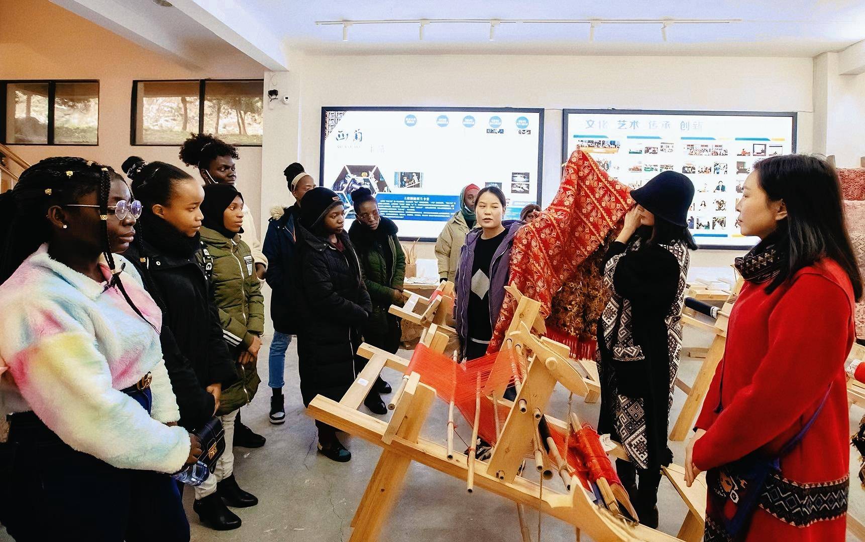 谭艳华、谭艳宾正在向外国留学生展示西兰卡普织锦技艺。(受访者供图)