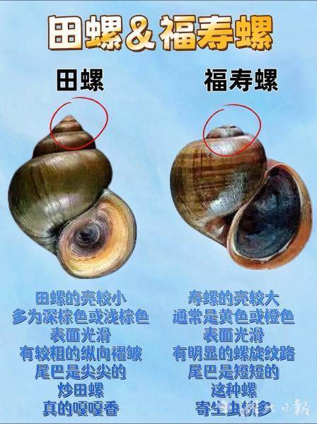 认识福寿螺,请勿随意食用。福寿螺形似田螺,但危害极大,可通过以下特征辨别:个头通常比田螺大;外壳多呈黄或橙色(田螺多为深褐);尾部短平(田螺尾部较尖);壳面有明显螺旋纹。