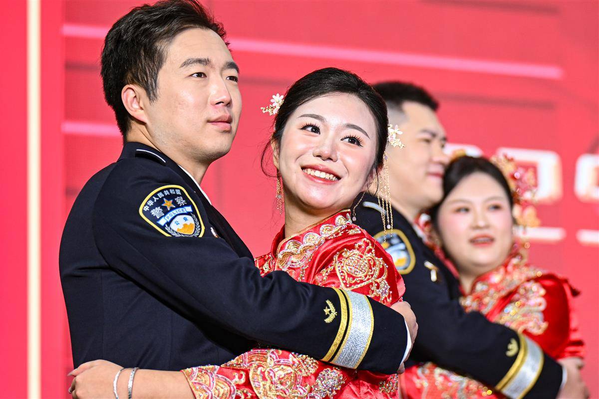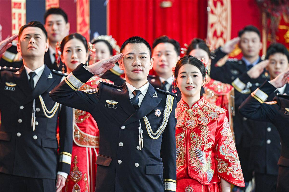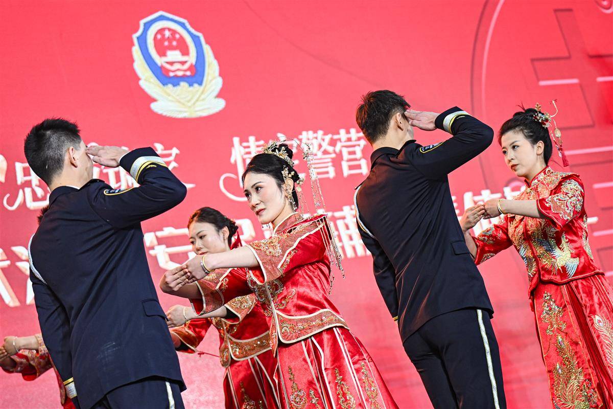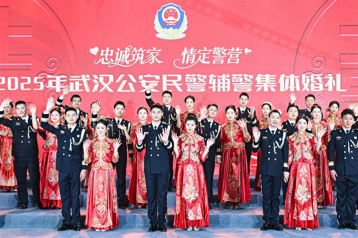 11月19日,在欢快而浪漫的音乐声中,一对对身着警服的英俊小伙手牵一身中式礼服的美丽新娘,款款步入武汉市人民警察训练基地警体馆,在亲人和战友们的见证下,来自武汉公安的22对民警辅警(武汉公安18对、武汉铁路公安4对)一起跨入幸福之门,许下相濡以沫、并肩同行的庄严承诺。