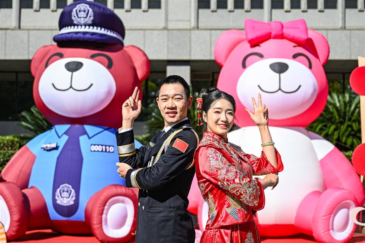 “真没想到,我们挥汗训练体能的警体馆,今天成了最浪漫的婚礼现场!”新郎刘偲扬望着身旁的新娘,满眼笑意。刘偲扬是一名青山分局民警,他的新娘寇妤,是一名英姿飒爽的武汉特警。相识四年后,他们于今日携手步入婚姻殿堂。刘偲扬动情地说:“在这个最熟悉、最‘硬核’的地方,许下最温柔的誓言,这种感觉,真的是独一无二,意义非凡。”(湖北日报全媒记者 任勇 杨然 通讯员 武龚轩 摄)