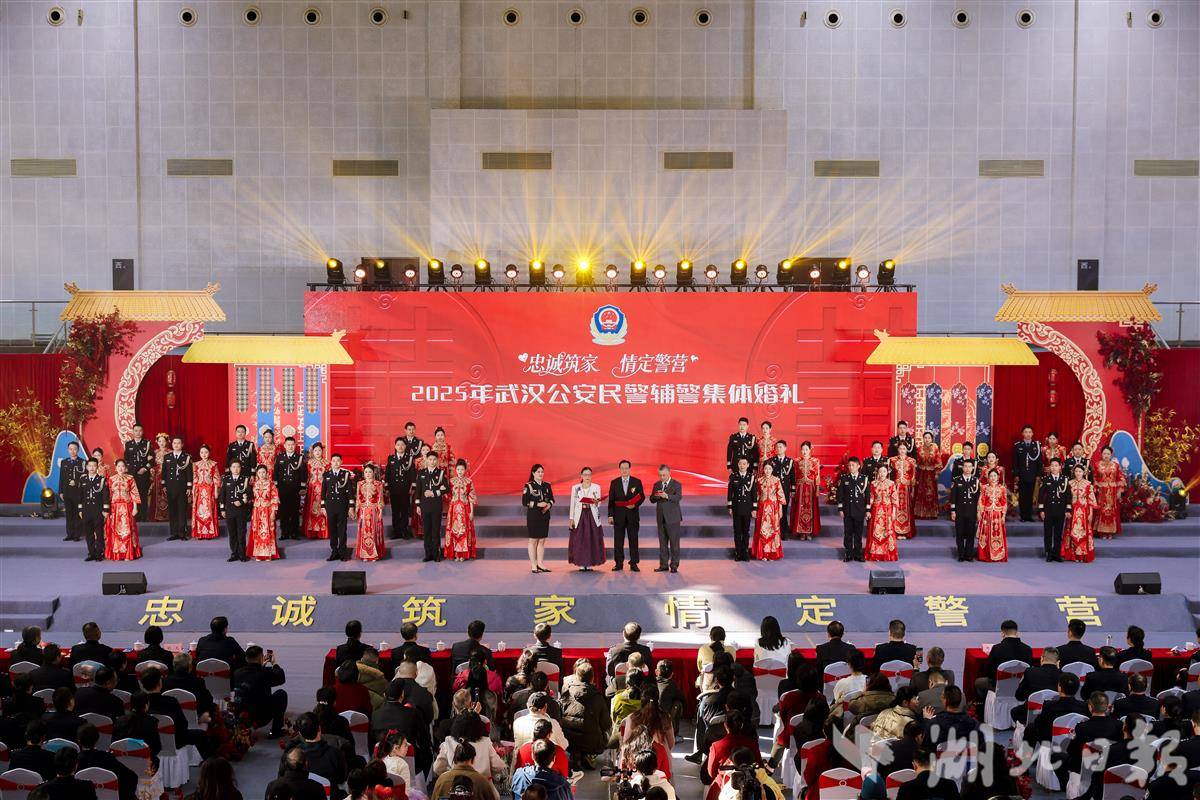 湖北日报讯(记者杨然、通讯员王威)11月19日,武汉市公安局人民警察训练基地警体馆内红墙焕彩、礼乐悠扬,“忠诚筑家·情定警营”2025年武汉公安民警辅警集体婚礼在此温情启幕。22对新人在战友、亲属的见证下携手登台,将对家国的忠诚融入彼此的誓言,开启“警营为媒、与爱同行”的人生新篇章。