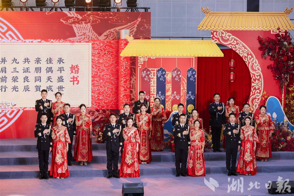 武汉公安为民警辅警举办集体婚礼。