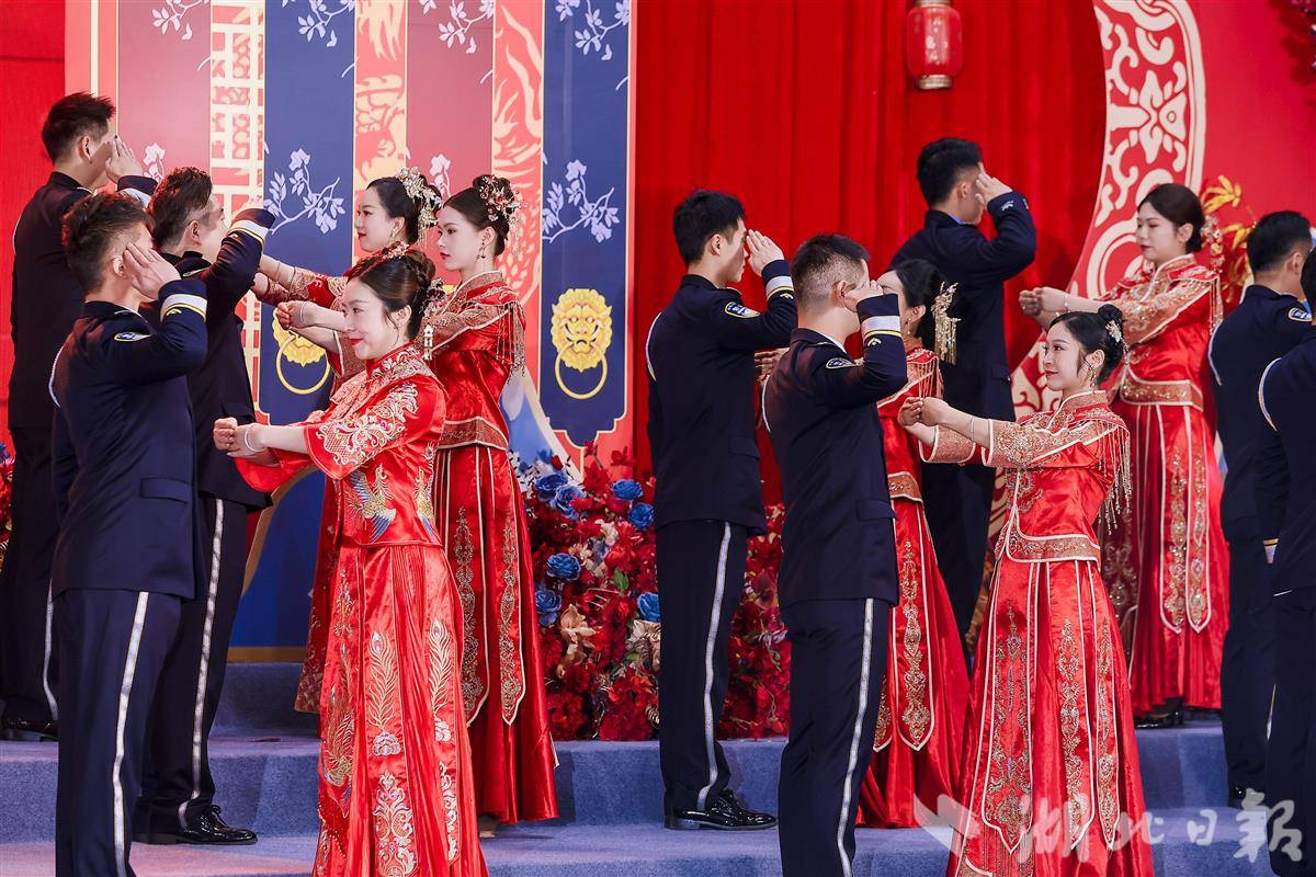 “此刻,我们荣幸地宣布,集体婚礼正式开始!”随着主持人的话音落下,22对新人依次踏上迎宾道,藏蓝的警服与火红的秀禾服交相辉映。每对新人登场时,大屏幕上都会浮现他们的爱情宣言,“藏蓝映日山河固,红袖暖心情笃”的字句,道尽了警营爱情的模样。