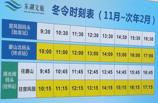 目前,东湖游船已更改冬季游船班次,方便游客在水上感受人与自然紧密接触的野趣,楚风园码头营运时间为上午九点半到下午四点半,磨山北码头为上午十点到下午五点。