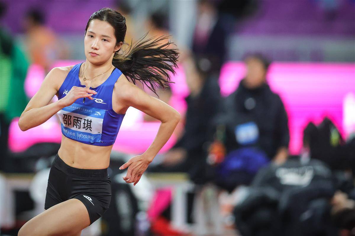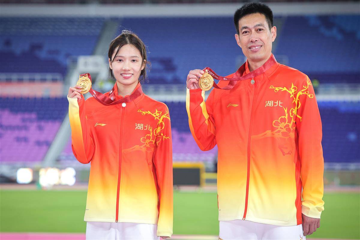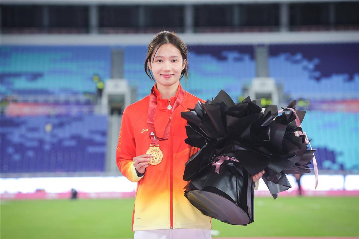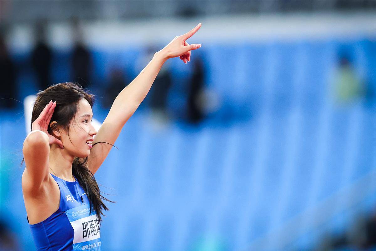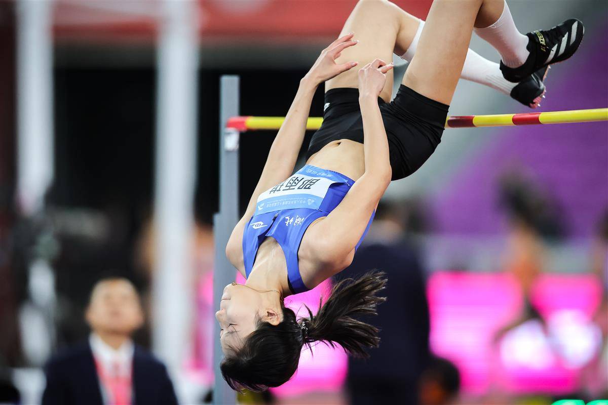 11月19日,第十五届全国运动会田径项目女子跳高决赛在广东奥林匹克体育中心举行。湖北队选手邵雨琪发挥出色,最终跳出1米90的成绩夺得冠军。上海队选手陆佳雯获得银牌,河北队选手胡麟鹏摘得铜牌。(湖北日报全媒记者 时龚 摄)