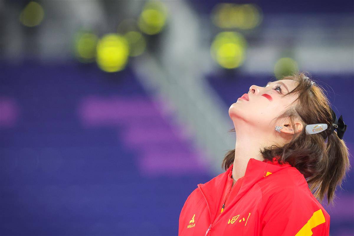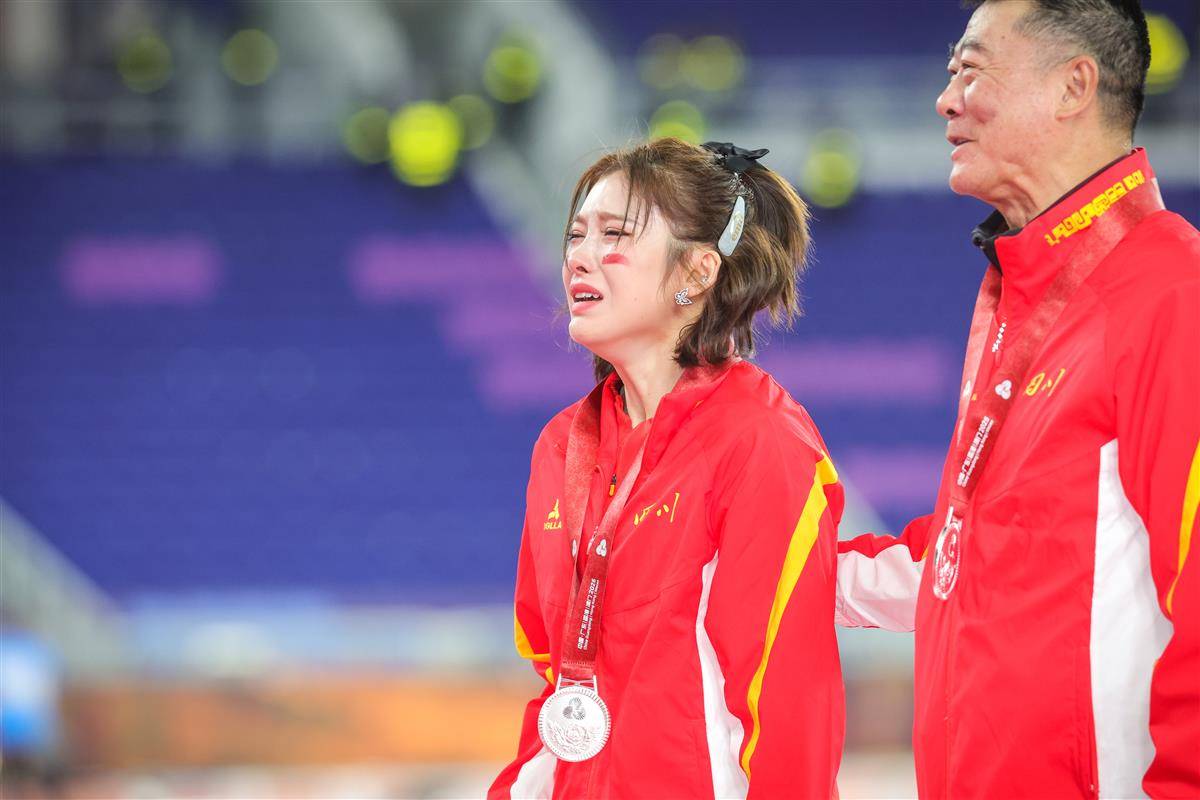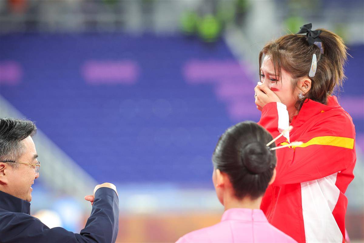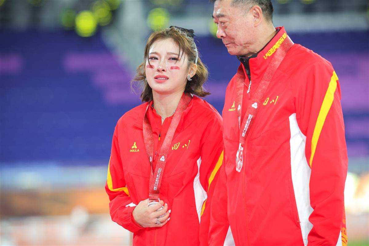 11月19日,第十五届全运会女子100米栏决赛举行,吴艳妮以12秒85夺得亚军,刘景扬12秒81拿下冠军。颁奖仪式上,吴艳妮看到银牌后控制不住自己情绪失声痛哭。(湖北日报全媒记者 时龚 摄)