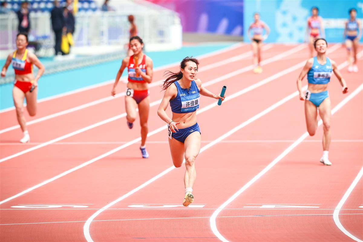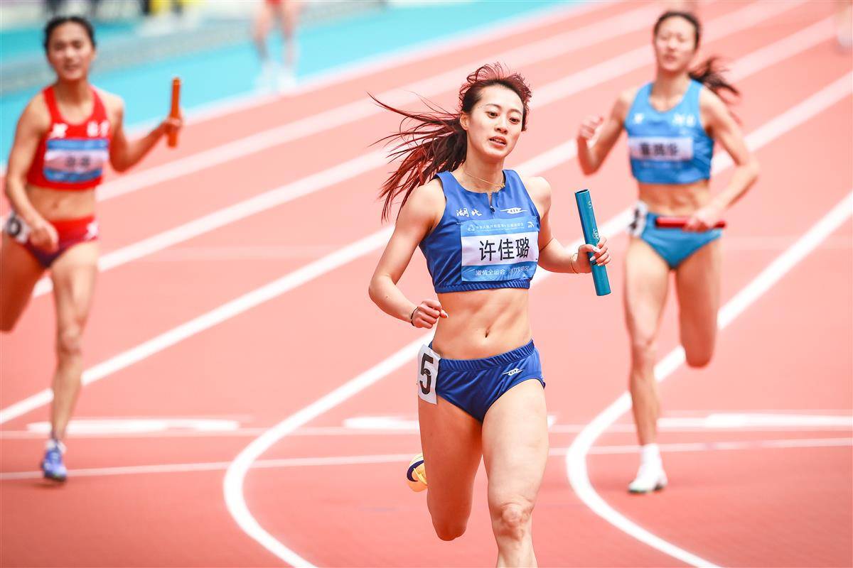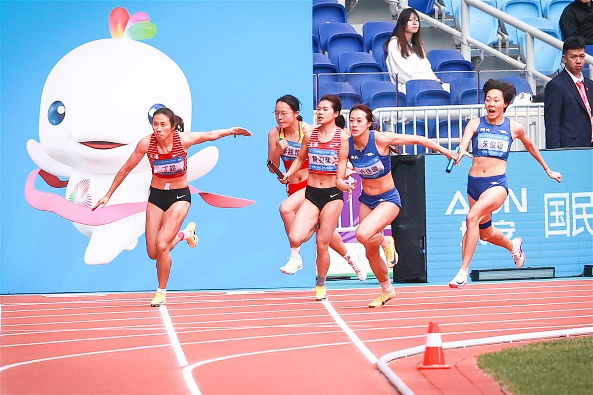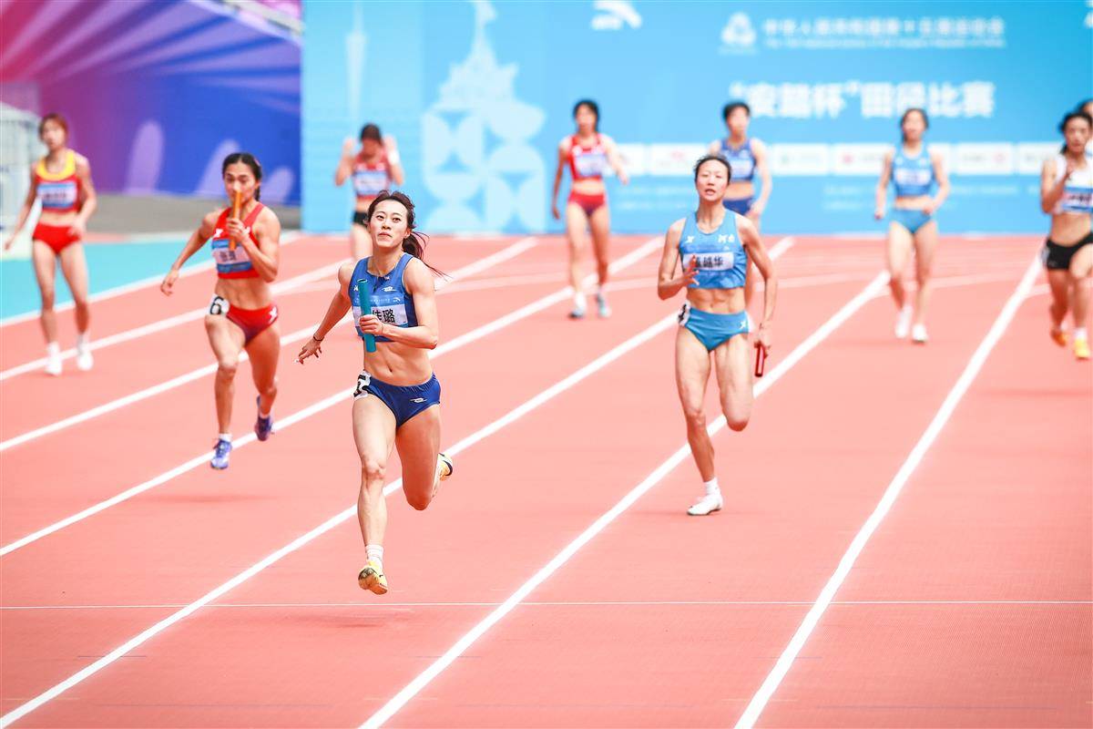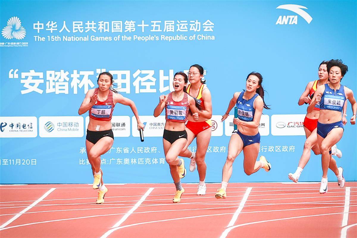 11月20日,广东奥体中心,十五运田径收官日举行女子4x100米接力比赛,湖北队以预赛第一的身份晋级晚间决赛。(湖北日报全媒记者 时龚 摄)