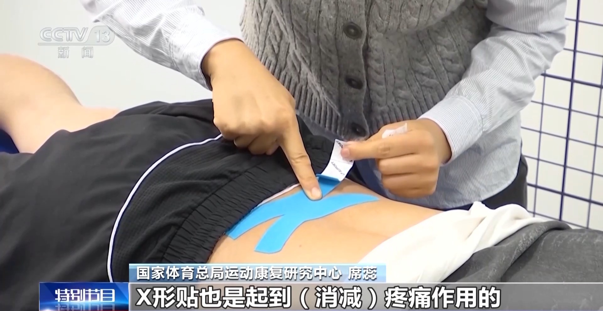 国家体育总局运动康复研究中心席蕊:一般在贴的时候,固定的锚点都要剪成弧形的,不同的剪法就是,大家能看到的可能有I形、Y形、灯笼形、爪形等,不同的形状是根据不同的需求来的,比如爪形和灯笼形一般是用来消肿和止疼的,I形和Y形一般是作用于肌肉功能的,起到激活或放松的目的,X形贴也起到消减疼痛的作用。