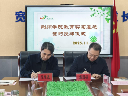 在荆州小学会议室,荆州小学副校长蔡艳妮主持荆州学院教育实习基地签约授牌仪式。荆州学院校长戴国强与荆州小学校长陈经尧共同签署了教育实习合作协议,荆州学院副校长聂好春向荆州小学授予“荆州学院教育实习基地”牌匾。