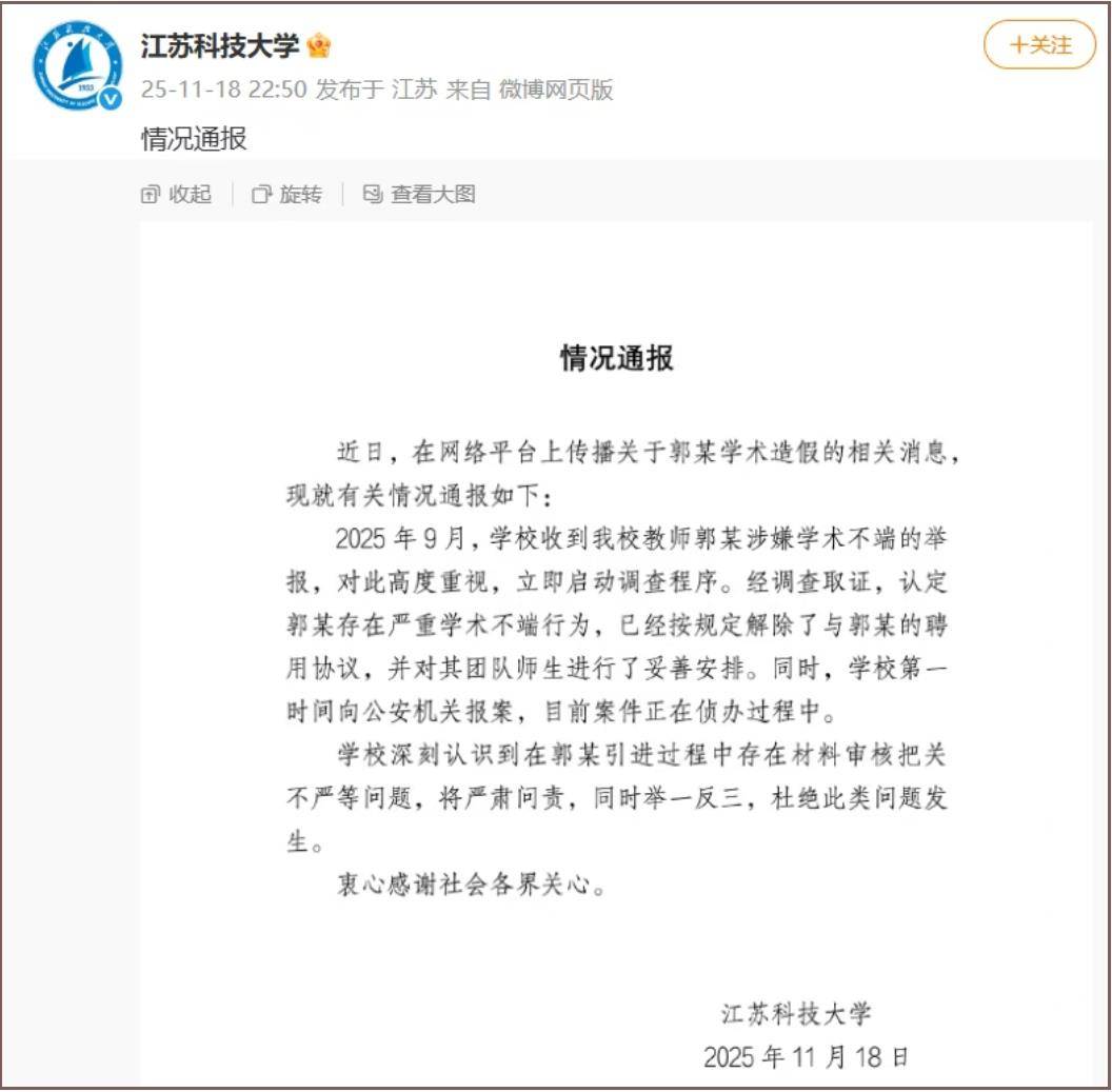 近日,曾任江苏科技大学首席科学家的郭某,被曝涉嫌学历造假、学术造假、侵占国家科研经费等问题。11月18日,江苏科技大学通报郭某学术造假事件:存在严重学术不端行为,已按规定解聘,案件正在侦办。