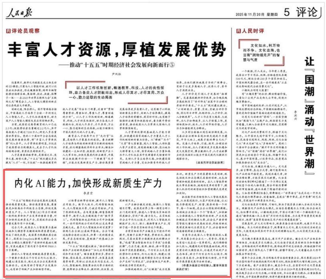 湖北日报讯 (通讯员志成)11月20日,百度创始人、董事长兼首席执行官李彦宏在《人民日报》发表题为《内化AI能力,加快形成新质生产力》的署名文章。他指出,推动人工智能更好赋能高质量发展,一个重要方面是让千行百业内化AI能力,构建AI原生能力,使之成为企业发展的原生推动力。