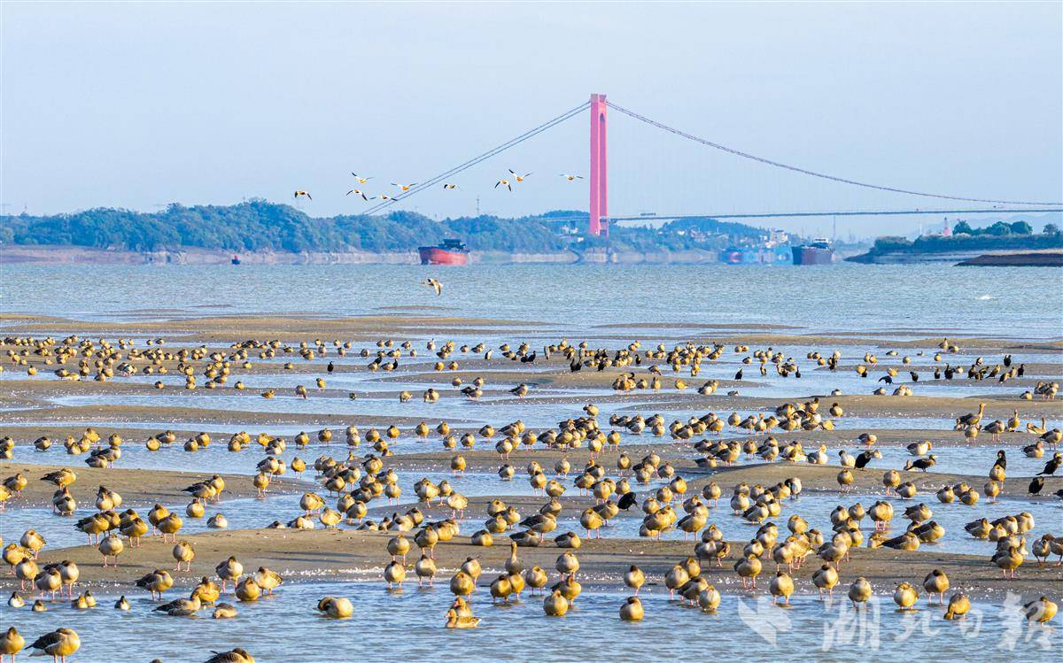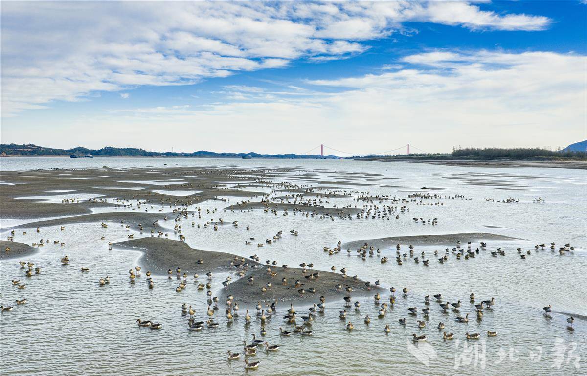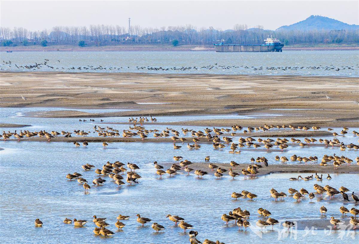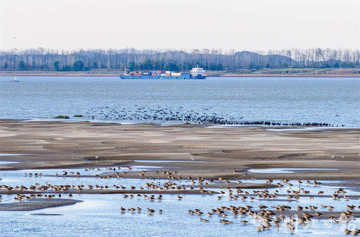 11月20日,在长江黄石段,成群候鸟在江面上觅食嬉戏,构成一幅美妙的冬日画卷。近年来,黄石市加快推进新型工业化,减污、降碳、资源循环利用等关键技术突破和应用,以科技协同创新助推长江大保护。生态环境不断改善,长江上野生鸟类品种和数量不断增加。(视界网 周巍 摄)