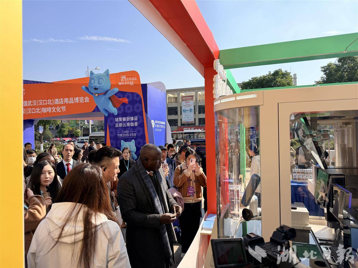 视线越过氤氲着草本香气的展位,汉交会的咖啡版图展现出更宏大的全球视野。不远处,深圳灵犀咖啡的展台被观众层层围住。银白色的精密机械臂如咖啡大师般优雅运转,磨豆、压粉、萃取、打奶……所有动作在方寸之间精准完成,最快60秒,一杯品质稳定的拿铁便稳稳送出。肯尼亚驻华大使威利·贝特先生刚刚从这只“铁臂”手中接过饮品,他惊喜地打量这杯咖啡,向身旁的参展商竖起大拇指,连声称赞“Very Good!”更进一步提到:“武汉拥有非常独特的供应链优势,水陆空运输体系高效便捷,我得好好了解一下,探索未来我们如何开展更深入的合作。”