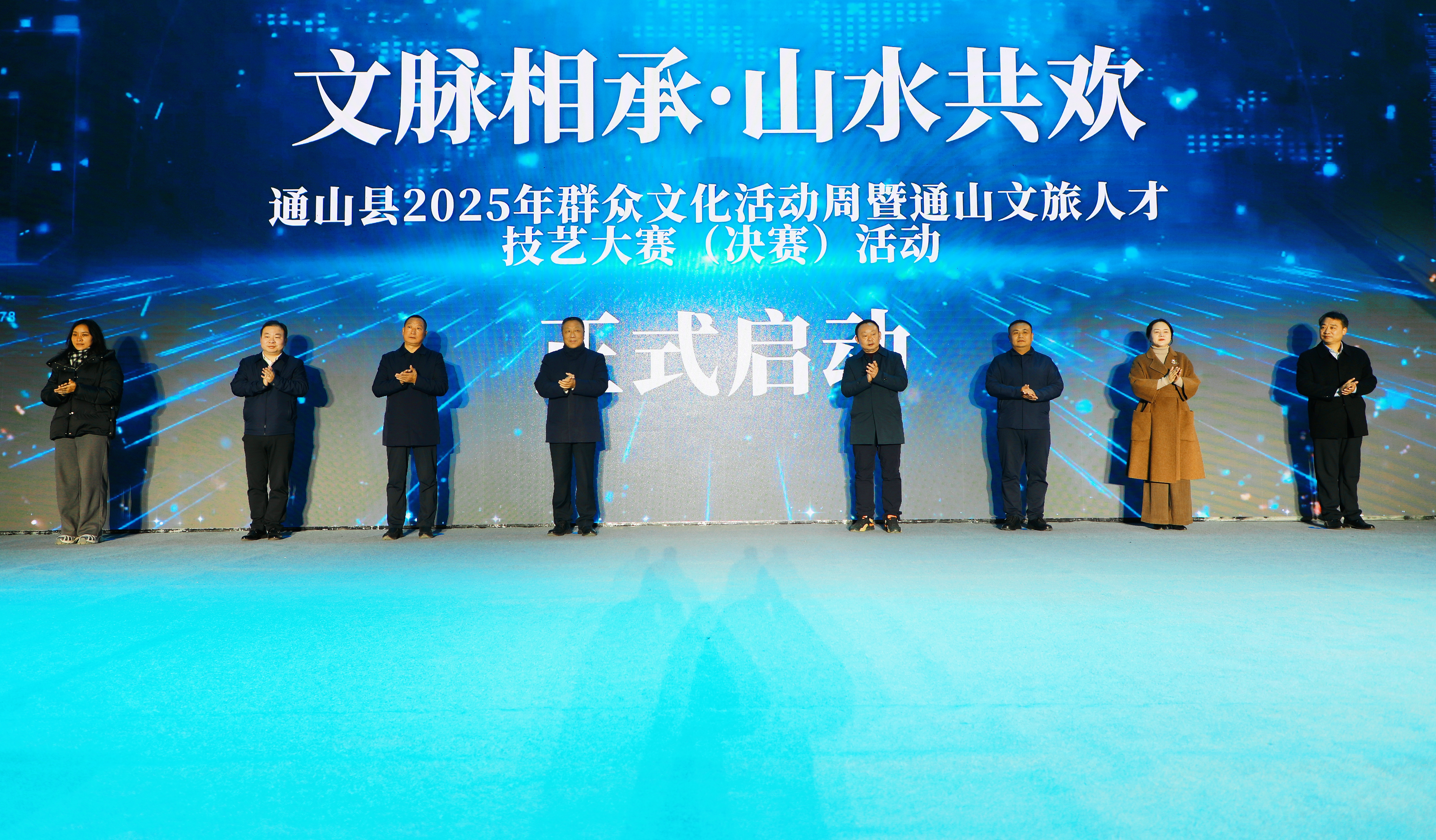 随后,省、市、县领导共同上台,在全场观众的倒数声中,一同按下启动掌印,标志着“文脉相承·山水共欢”通山县2025年群众文化活动周暨通山文旅人才技艺大赛(决赛)正式启动。