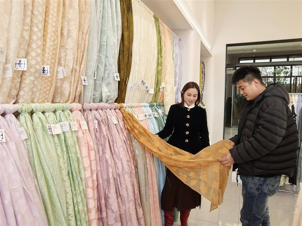 走进恒薇纺织的展厅,琳琅满目的面料样品整齐陈列。这个面积70多平方米的空间,汇聚了800多个品类的面料,以女装提花、剪花类为主打。老板周国荣和爱人张帆穿梭其间,热情地为来宾讲解产品特色。