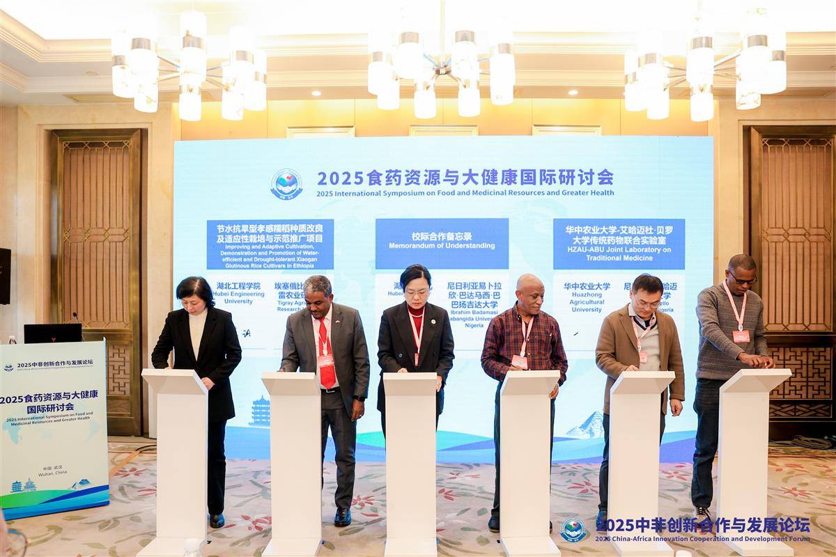 研讨会现场,湖北工程学院、华中农业大学、武汉科技大学等与埃塞俄比亚提格雷农业研究所、南非比勒陀利亚大学、布隆迪大学等非洲国家科研机构、高等院校,签署了8项中非国际合作协议,涵盖联合研发、平台共建、人才培养等领域。这些合作协议的签署,标志着中非在食药资源与大健康领域的合作进入了机制化、平台化的新阶段,对带动农业增产、农民增收,助力构建人类卫生健康共同体,深化各国在公共健康和现代农业领域的合作具有重要意义,是共建“一带一路”倡议与中非合作论坛框架下科技创新合作的生动实践,为落实《中非合作论坛—北京行动计划(2025-2027)》注入新动能。