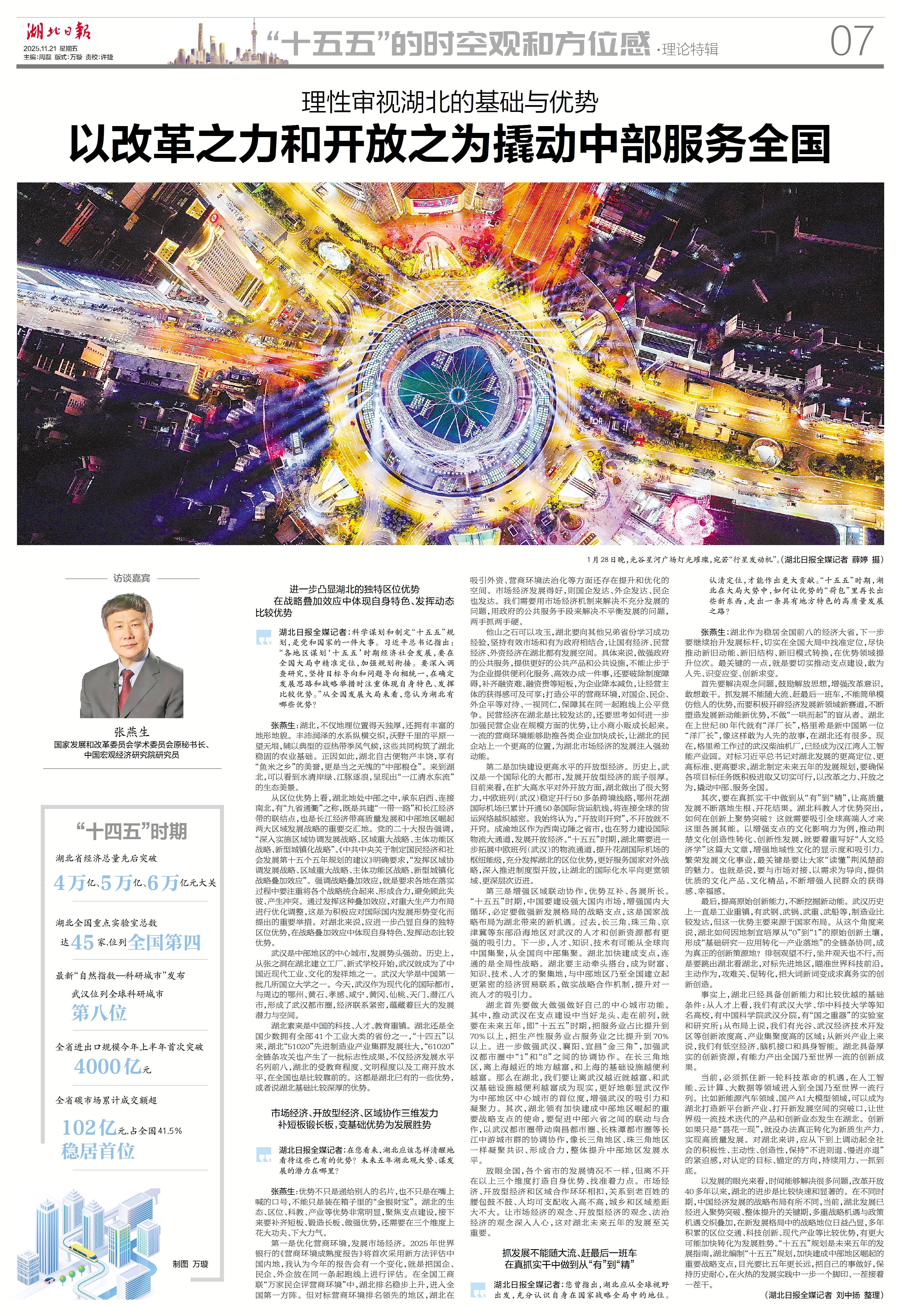 张燕生:湖北作为稳居全国前八的经济大省,下一步要继续抬升发展标杆,切实在全国大局中找准定位,尽快推动新旧动能、新旧结构、新旧模式转换,在优势领域提升位次。最关键的一点,就是要切实推动支点建设,敢为人先、识变应变、创新求变。