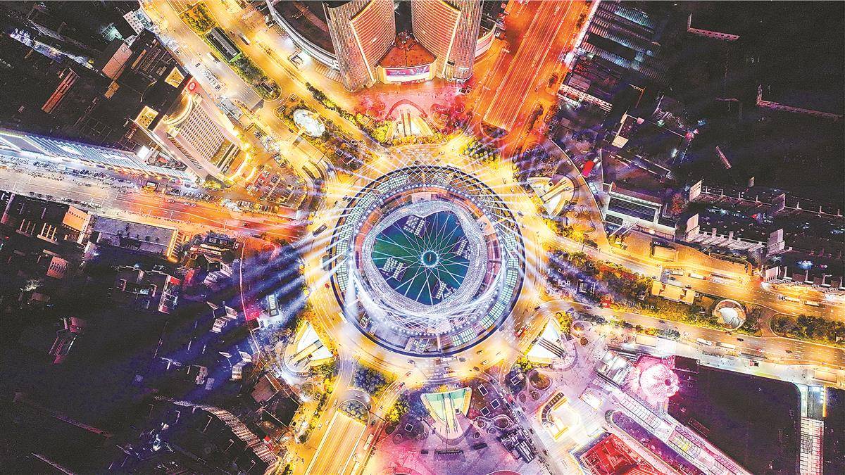 光谷星河广场灯光璀璨,宛若“行星发动机”。(湖北日报全媒记者 薛婷)
