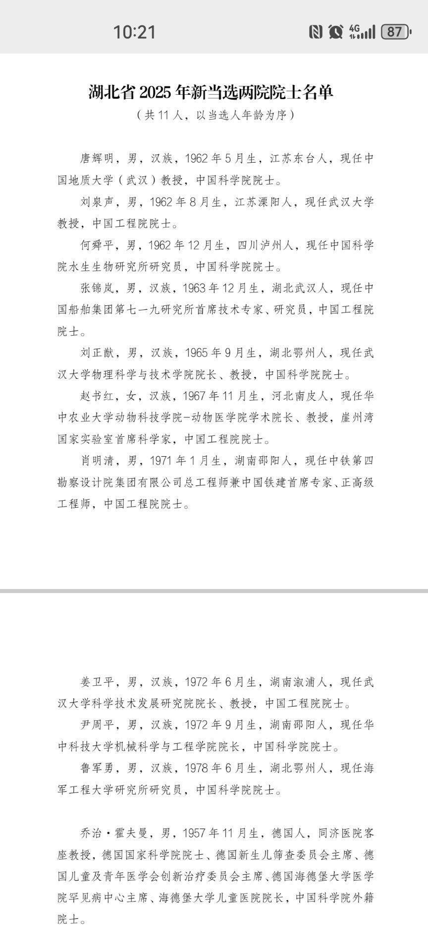 综合相关消息,湖北共有60多位有效院士候选人,其中入选新增院士11位,人数位列全国前5位,首次突破两位数,为历次增选人数最多的一次,诞生了湖北首位外籍院士。至此,湖北两院院士超90位。