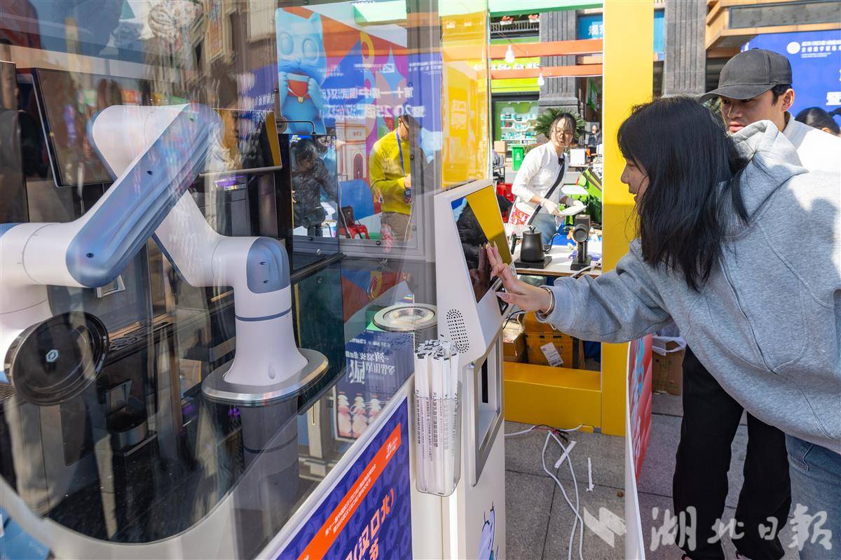 2025年11月20日,2025武汉(汉口北)商品交易会咖啡茶饮展现场,市民通过触屏下单,咖啡机器人即刻制作并用机械臂送餐,科技感十足!展会集结40余家全球咖啡庄园、智能设备及烘焙商,展示从种植到消费全链条产品,还有机器人拉花赛、咖啡大师特调、豆品鉴等精彩互动。(湖北日报全媒记者 倪娜 通讯员 黄宣 刘春 摄)