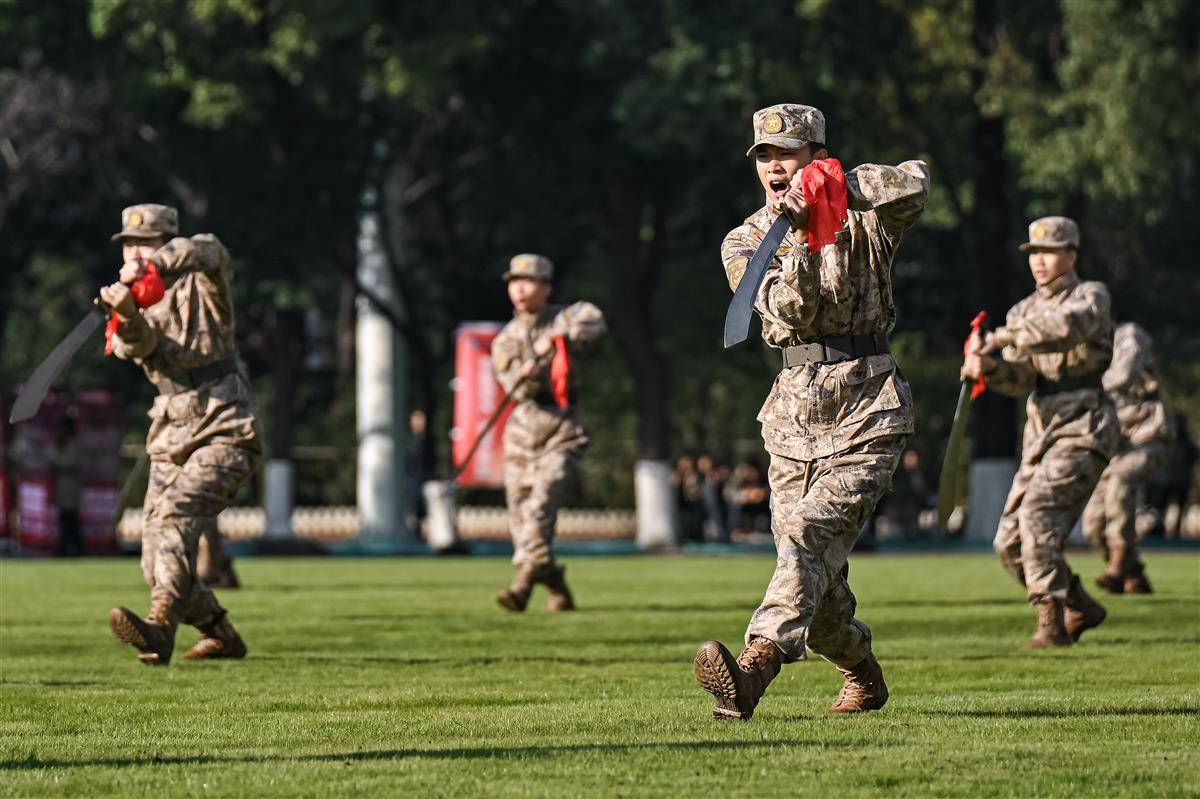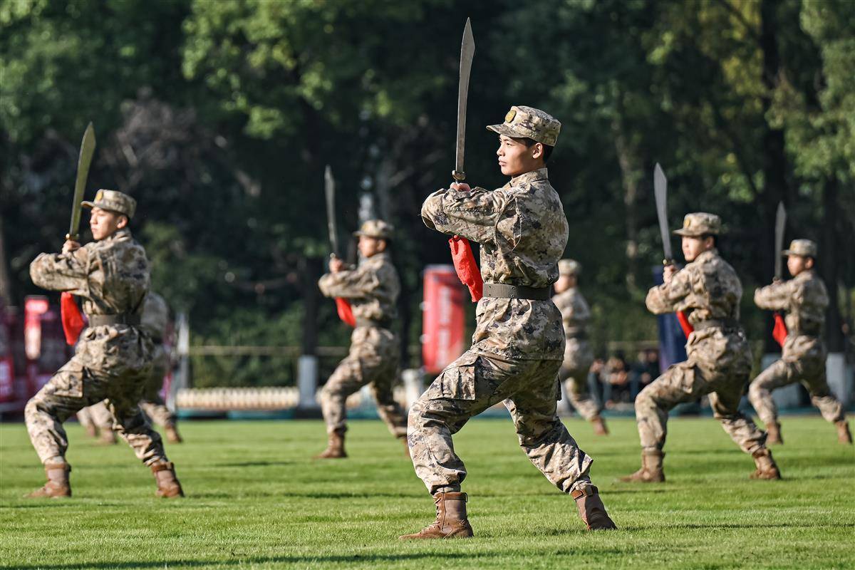 在开幕式现场,学员们演示“破锋八刀”。此刀法诞生于抗日战争时期,是中国军队大刀队为对抗日军刺刀所创的实战杀招。劈、砍、撩、抹、带、格、抽、刺,核心的八式刀法简洁刚猛,一击制敌。