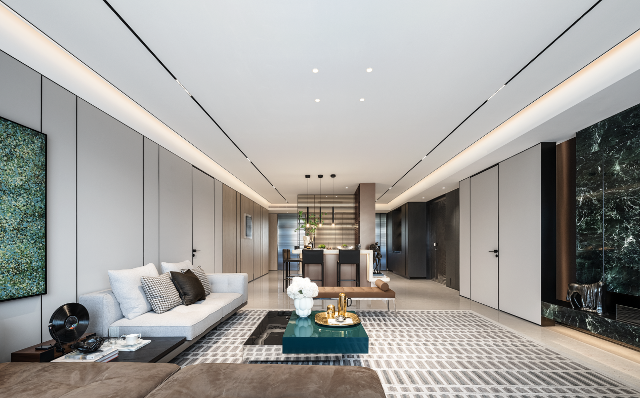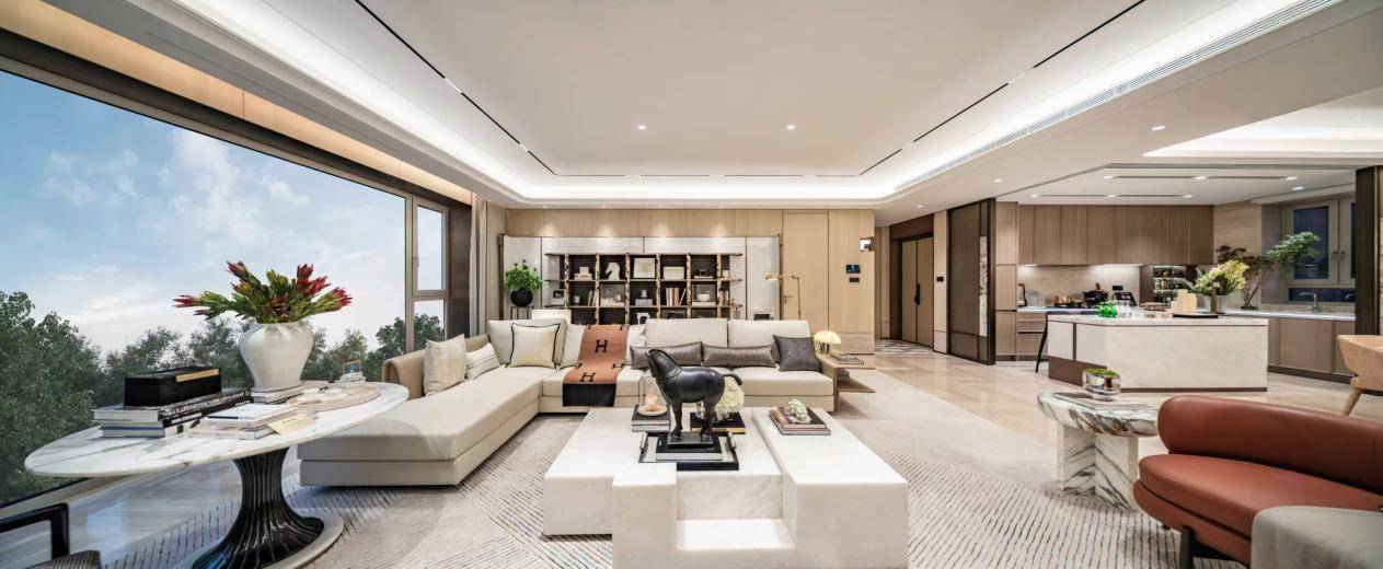步入高定样板间,LDK一体化的开阔格局瞬间舒展了对空间的感知。视线沿着地面延伸,层次丰富的灯光系统营造出艺术馆般的氛围。每一处细节,都在诉说一种内敛的格调:绝非张扬元素的堆砌,而是融入日常的审美与质感。