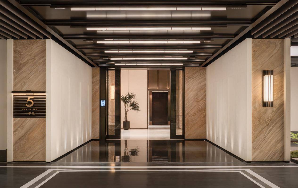 望向远方,建筑立面采用国际顶豪标志性的落地窗+超白玻幕墙,与暖色石材及金属框架细腻交融,在光影间呈现简约的现代气质。归家动线自然延伸至单元大堂,墙面选用的月光米黄石材,依循黄金分割比例构筑出空间美感。