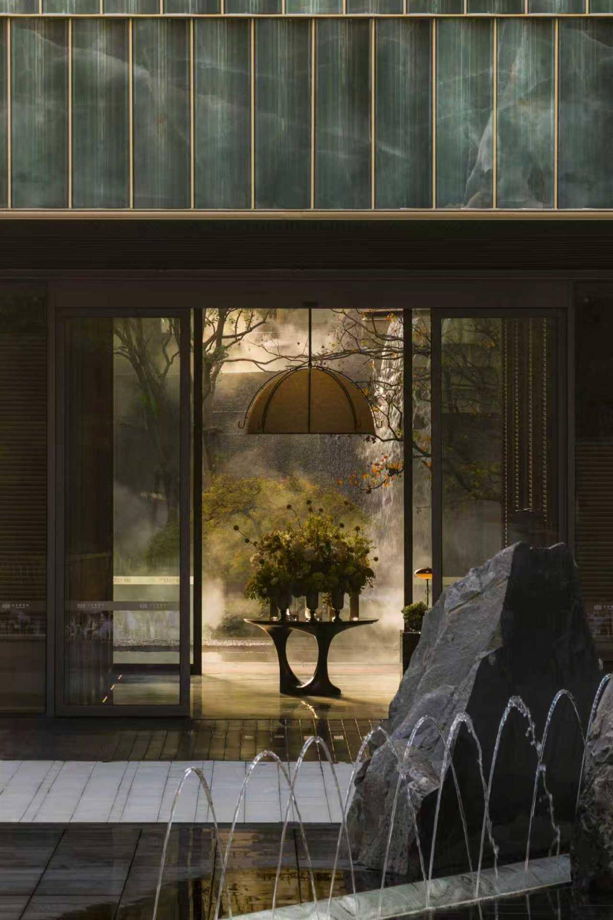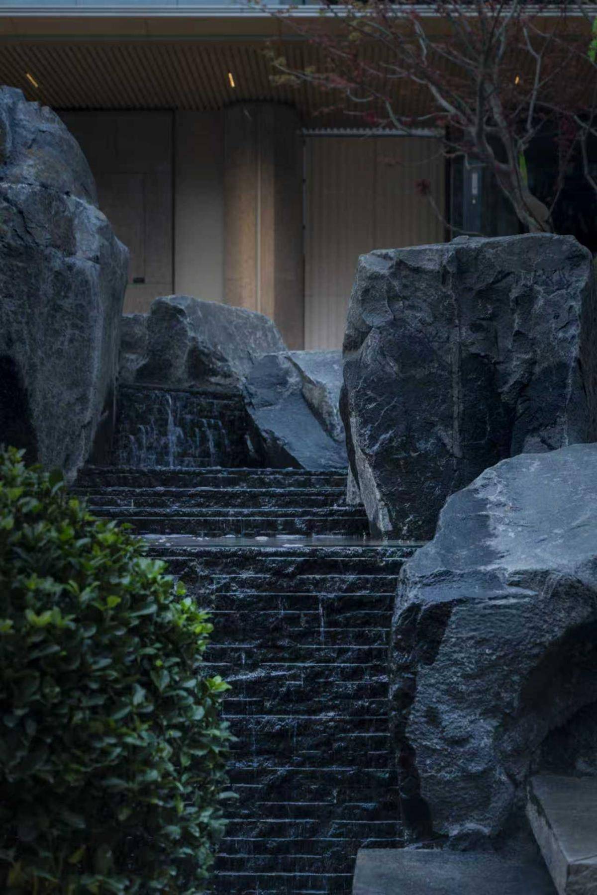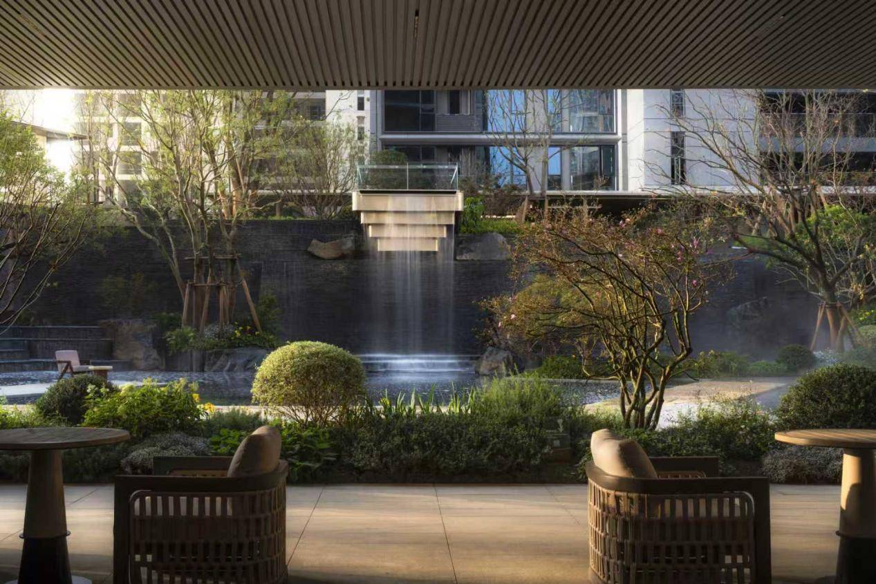 穿过以冰蓝玉石打造的归心大堂,便步入其示范区的园林核心——山水前庭。此处以长超40米、高约5.3米的叠水飞瀑与260平方米镜面水池相映,营造出“未见其宅,先闻其声”的归家意境。借助山地高差打造出的起伏的台地、风雨连廊与13个瀑布组成的瀑布群,共同呈现出一幅立体山水长卷。