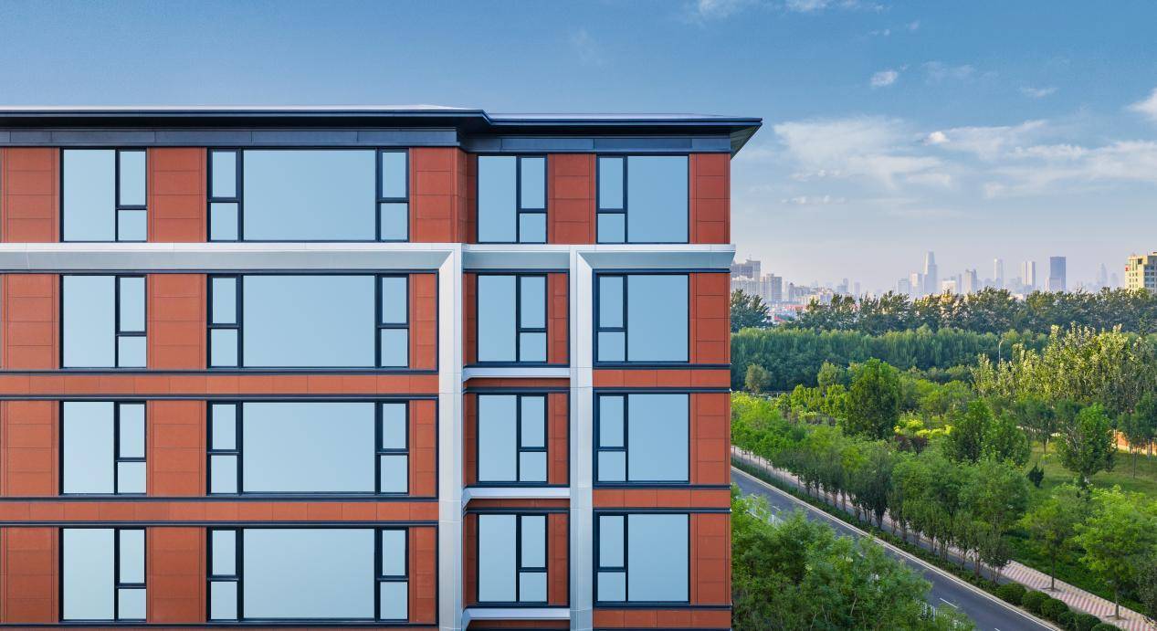 天然红陶零漆立面在阳光下显露温暖质感,月光银铝板勾勒出现代线条,与通透的玻璃幕墙,共同构成了建筑立面明暗交错、富有韵律的视觉效果。光影游移间,建筑仿佛被赋予生命、有了呼吸。
