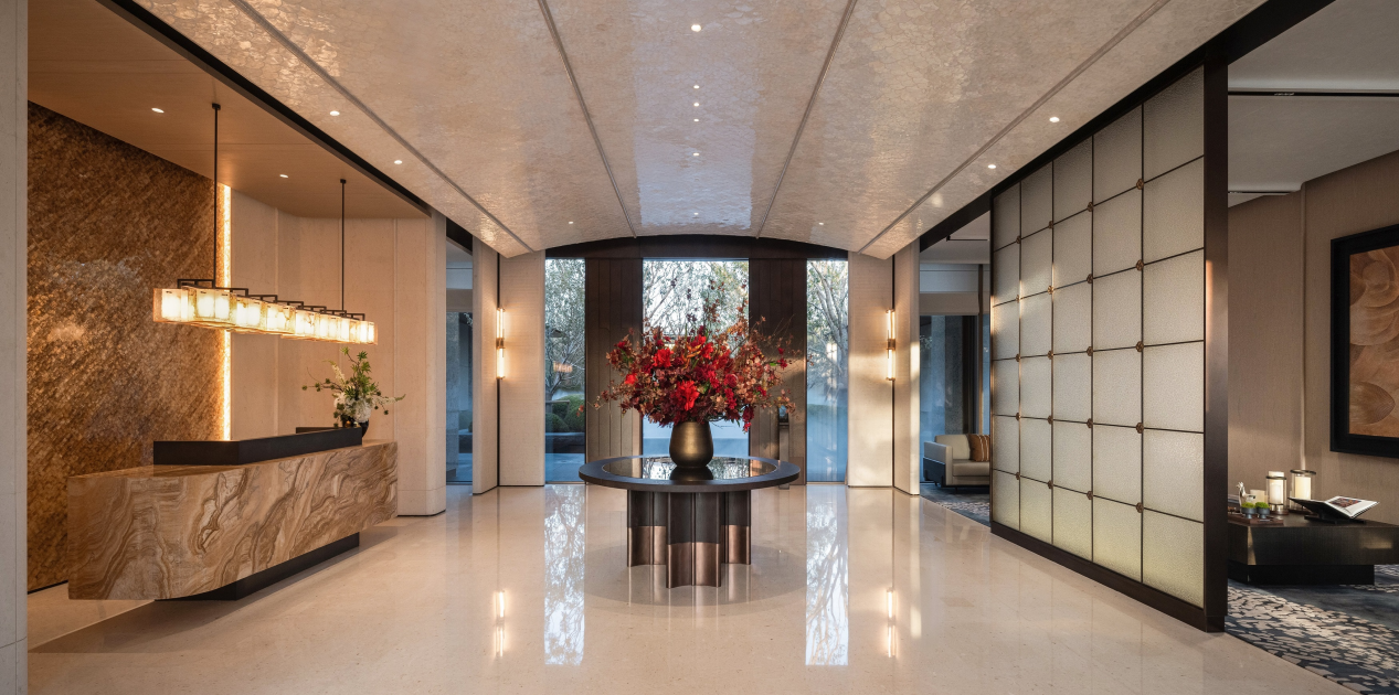 在最新亮相的社区大堂入口处,百年迎客松静静迎候,拉开归家序幕。步入其间,弧形穹顶勾勒出优雅的空间韵律,温润的贝母材质搭配暖色调天然石材,精心调试的灯光序列烘托,营造出艺术馆般的沉静高雅氛围。