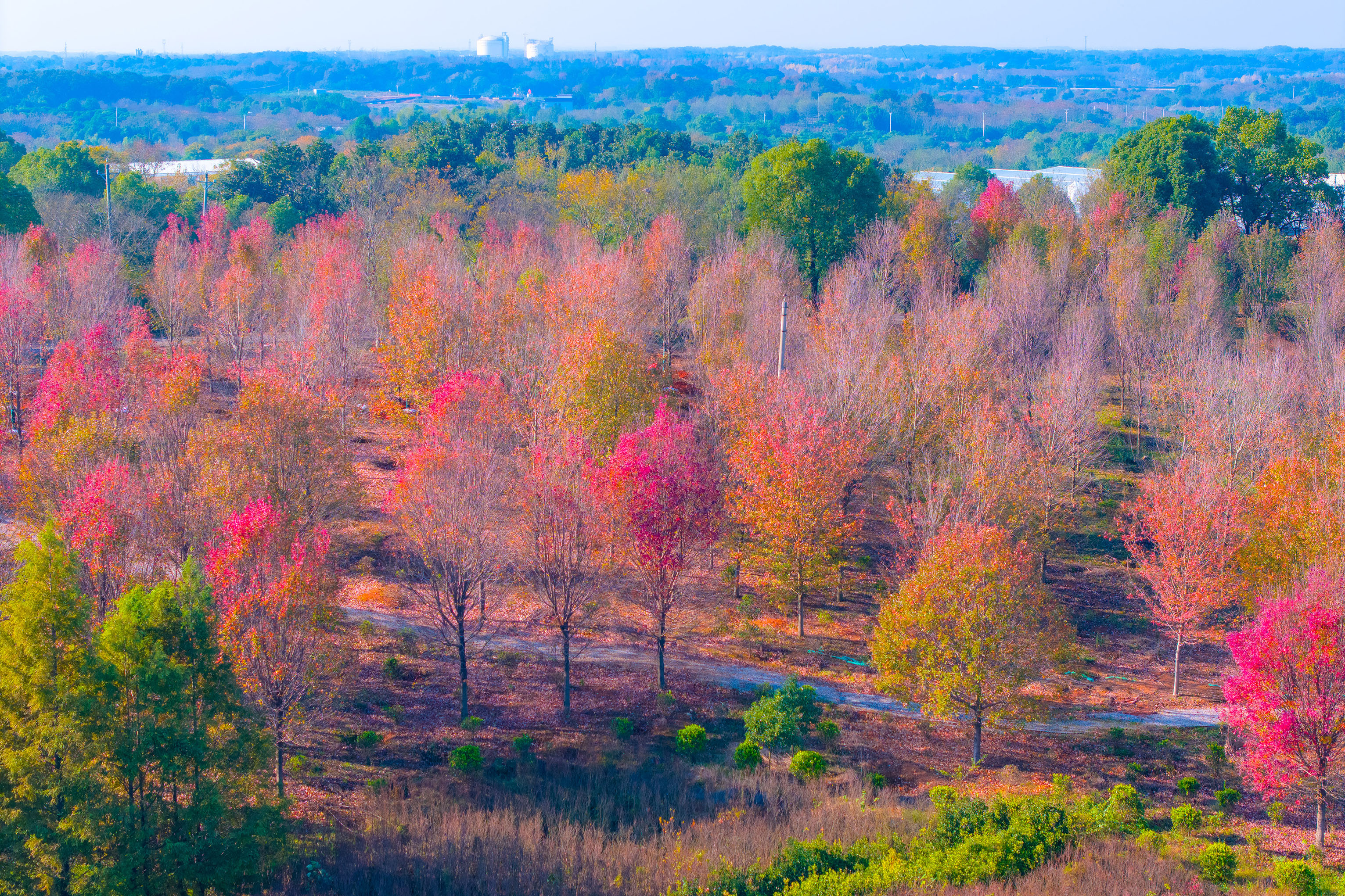 与此同时,作为安山生态明珠的安山郊野公园红叶谷也同样迎来了高光时刻。这里种植的“十月光辉”“夕阳红”等名贵红枫品种正值盛彩,深红、赭石、金黄交织碰撞,构成了一条绚丽的景观长廊。