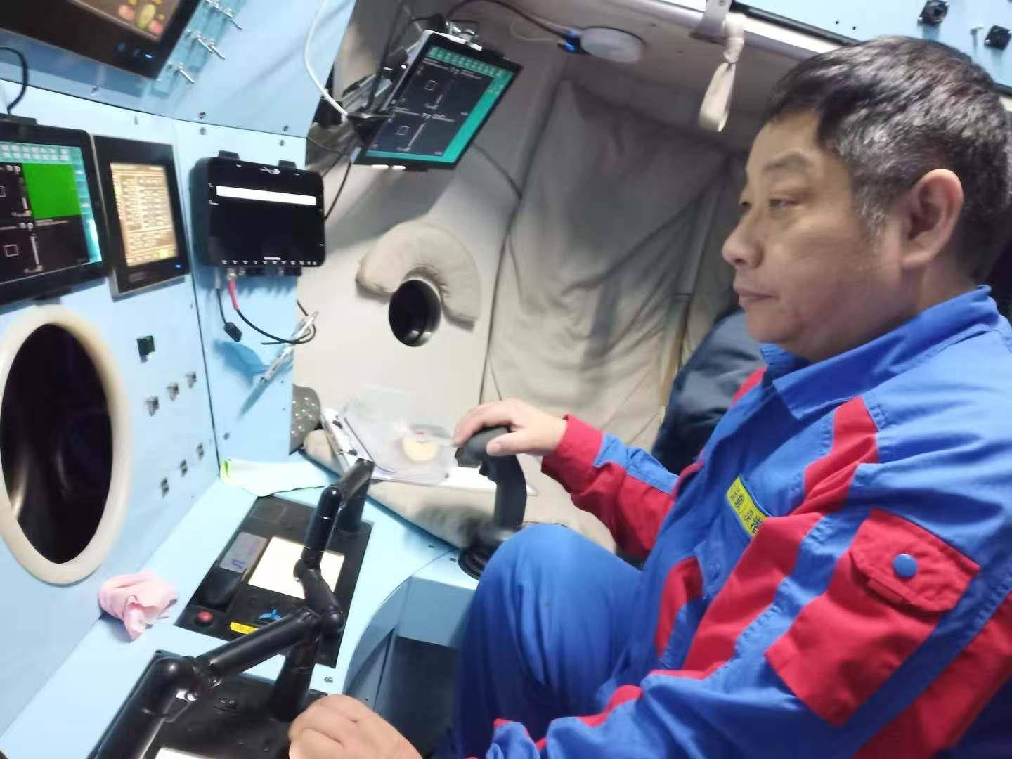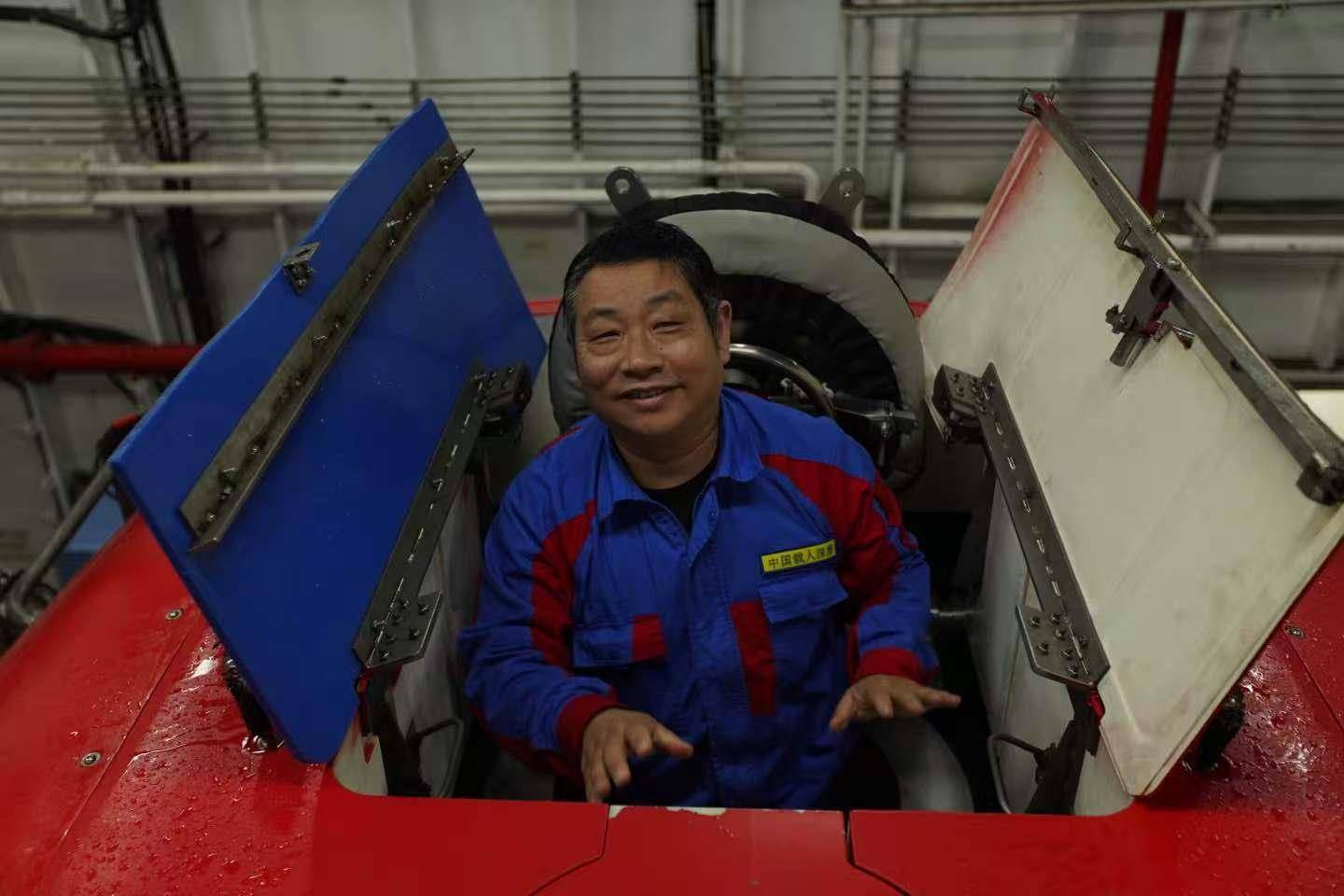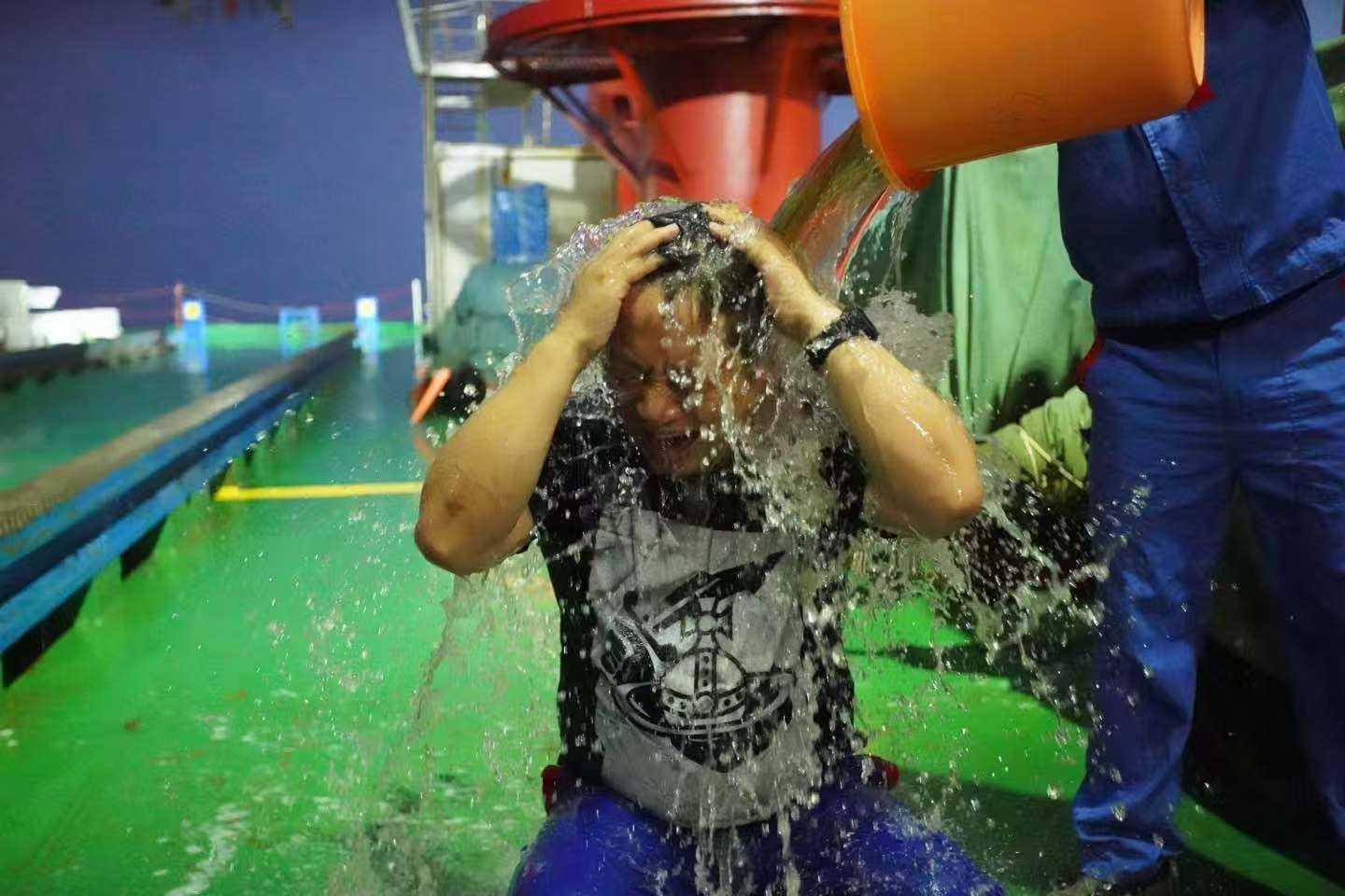 2019年,何舜平从马里亚纳海沟东部深潜出仓后接受泼水礼。(受访者提供)