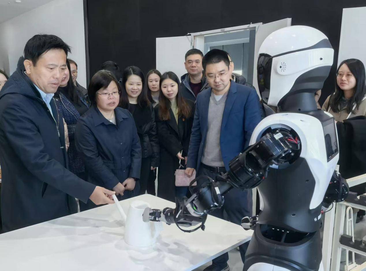 交流结束后,与会人员走进企业研发空间,实地了解机器人研发进展。一台名为“荆楚精灵”的机器人正在测试中——它轻松端起桌上的水杯,动作连贯而稳定,展现出接近人手的抓握与操作精度。