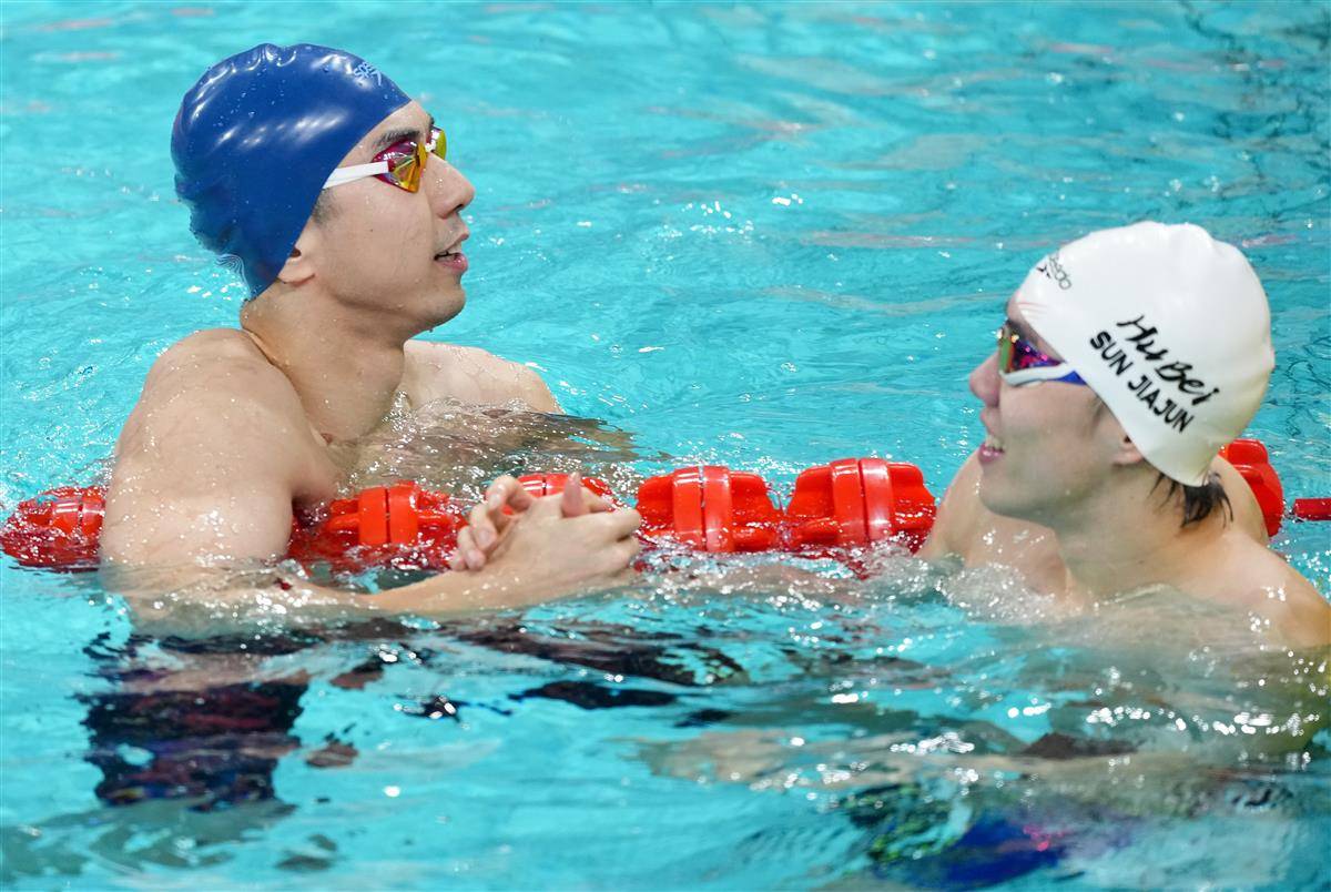 闫子贝(左)率队勇夺男子4×100米混合泳接力冠军。(新华社发)
