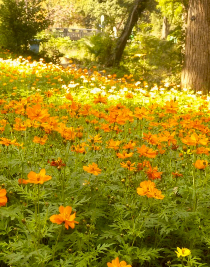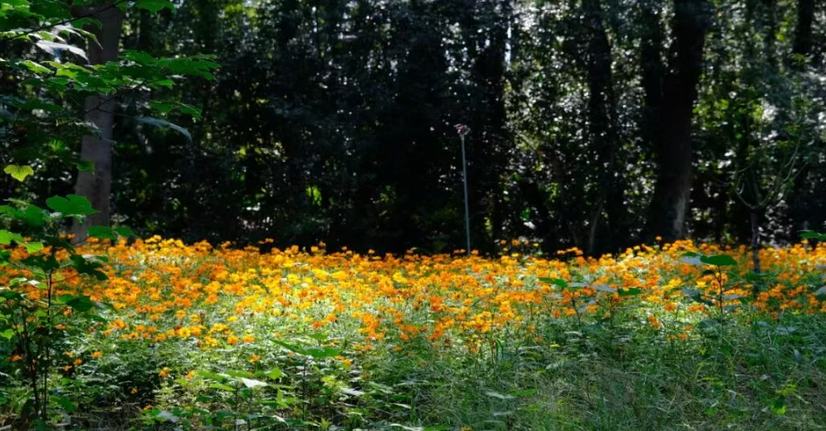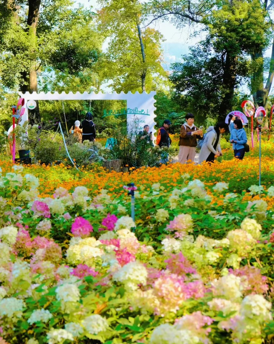 硫华菊泼洒出大片的橙黄,为粉白相间的圆锥绣球织就一块厚实的秋日地毯。