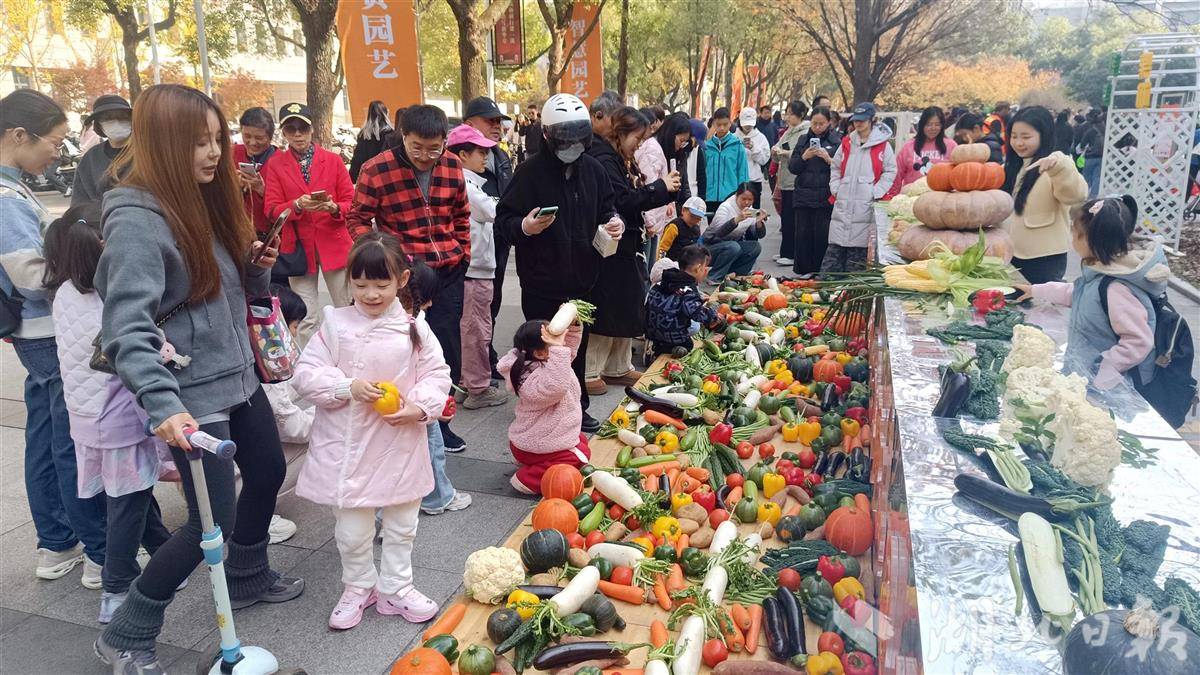 花菜、彩椒、西红柿、南瓜、茄子、萝卜、黄瓜等多种蔬菜色彩缤纷,构成一幅生机盎然的画卷,生动讲述园艺学科从田地到餐桌的故事,师生市民共同享受丰收的喜悦。