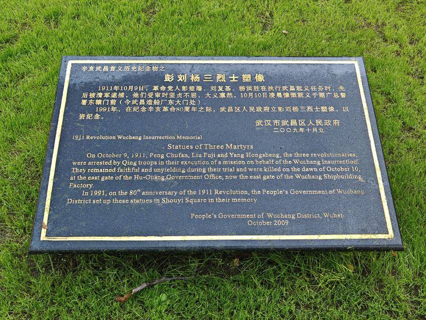 1911年10月9日,武昌起义前夕,革命党人彭楚藩、刘复基、杨洪胜因革命机关遭清廷查获不幸被捕。次日凌晨,他们在湖广总督署东辕门外英勇就义,壮烈牺牲。而就在他们牺牲仅18小时后,武昌起义的炮火便划破了夜空,震惊世界。为了永远缅怀这三位烈士的丰功伟绩,武昌区于1981年将原平湖门至阅马场路段更名为彭刘杨路,并于1991年辛亥革命80周年纪念日,在彭刘杨路与武珞路交汇处建立了这座塑像。