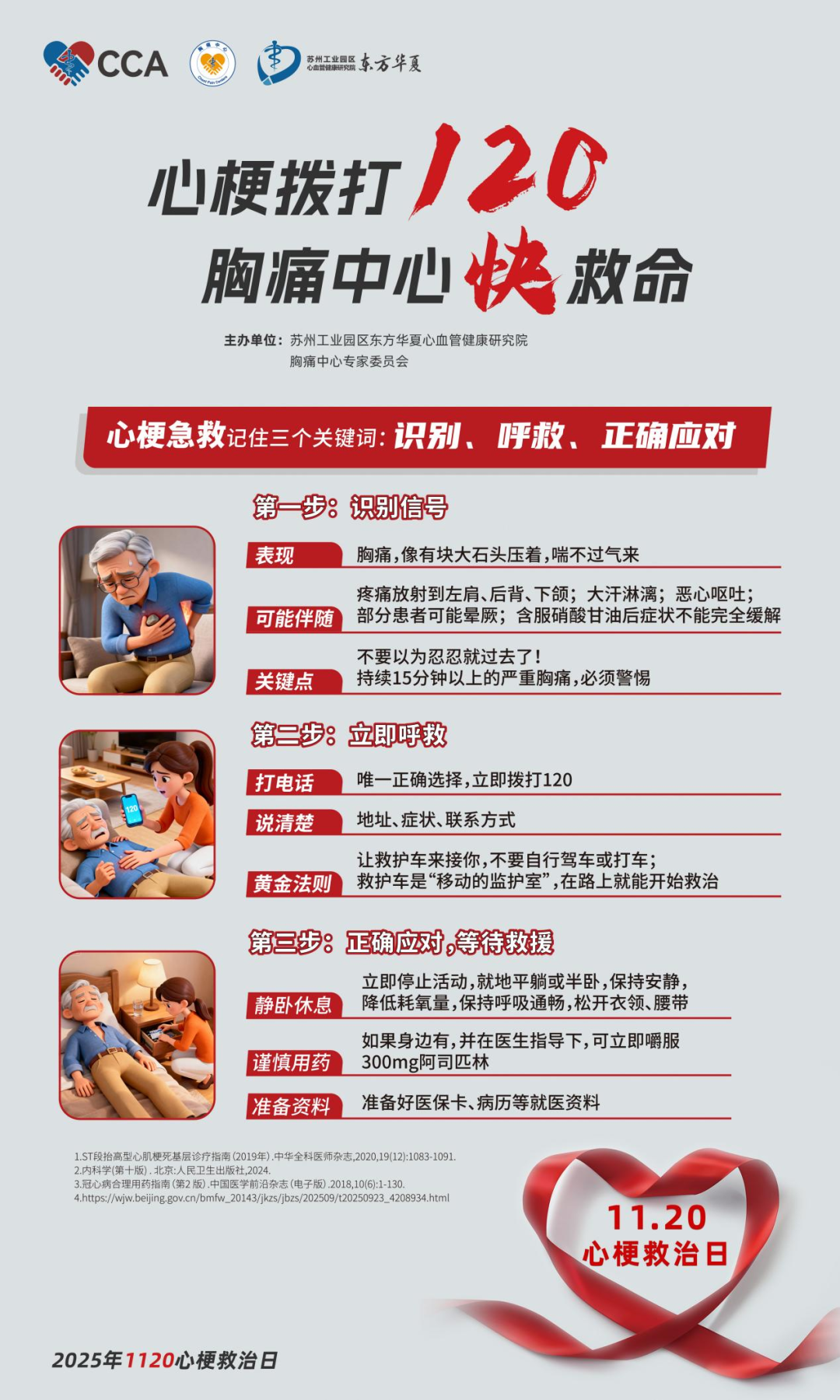 每年11月20日是“中国心梗救治日”,“1120”的核心寓意是:发病后1分钟内识别症状,120分钟内抵达医院救治——心梗抢救的黄金时间窗为2个小时,每延迟1分钟,心肌细胞就会大量坏死,早识别、早呼救、早救治是降低死亡率的关键!