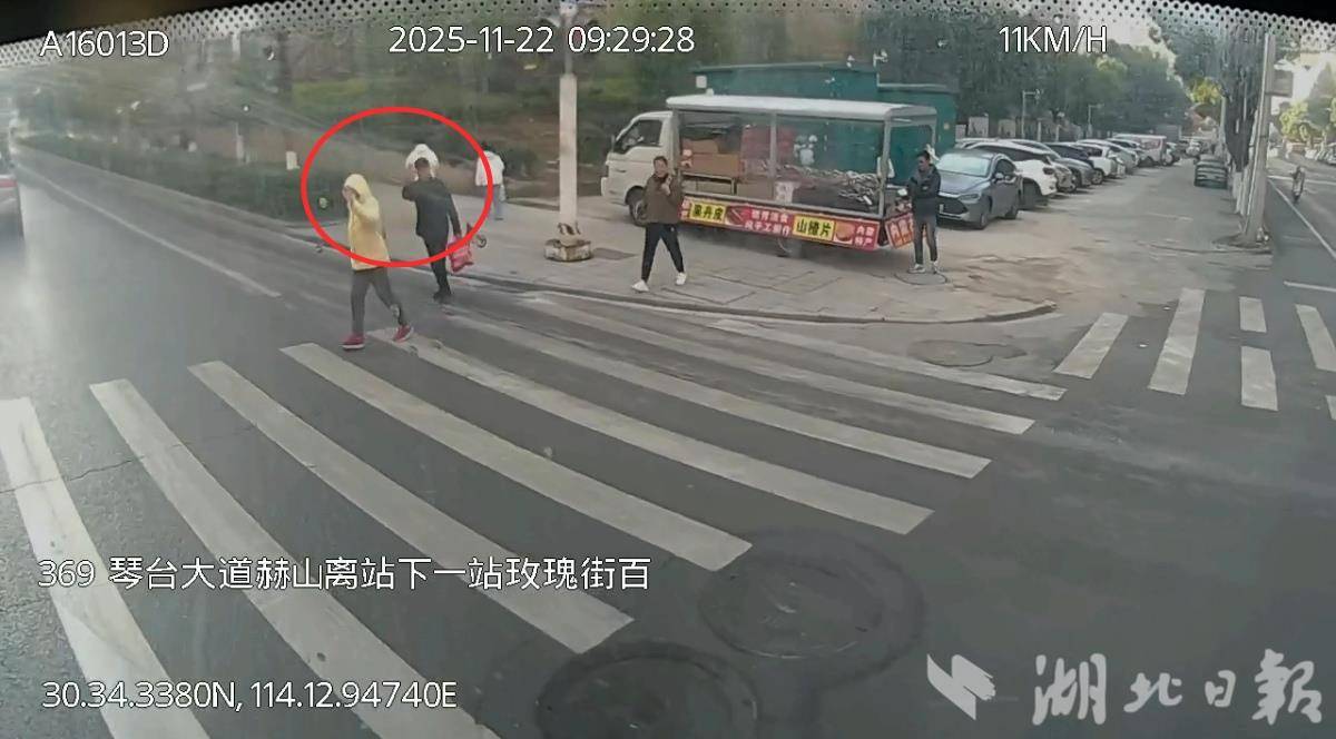 车载监控视频显示:当天上午369路驾驶员杨波驾驶2325号车由仙女山路琴断口南岸开往鄂渚路官堤路。9时29分,当车辆行驶至琴台大道赫山一处路口时,杨波远远望见斑马线前三人驻足。他提前减速、稳稳停车,右手向外轻挥,示意“您先请”。随后,行人快步通过斑马线,并对杨波挥手表示感谢。